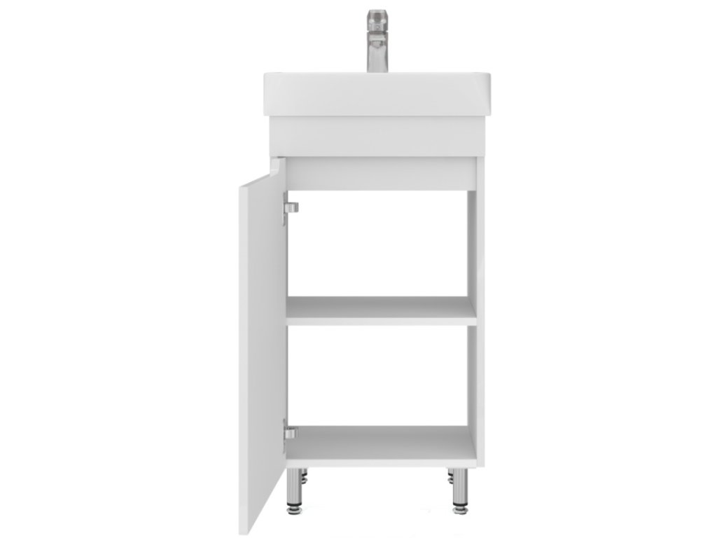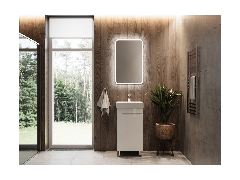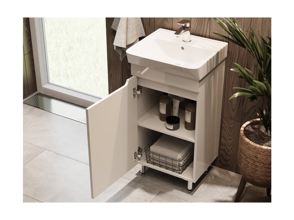 Designová skříňka včetně umyvadla v provedení na nožičkách se hodí do jakékoliv stylové koupelny. Skříňka obsahuje jedny dvířka. Skříňka neobsahuje úchyty, jejich funkci plní speciální frézování na povrchu skříňky. Skříňka je určena k instalaci na podlahu, má však také přídavné uchycení na stěnu. Umyvadlo, které je součástí skříňky, je vyrobeno z vysoce kvalitní keramiky.