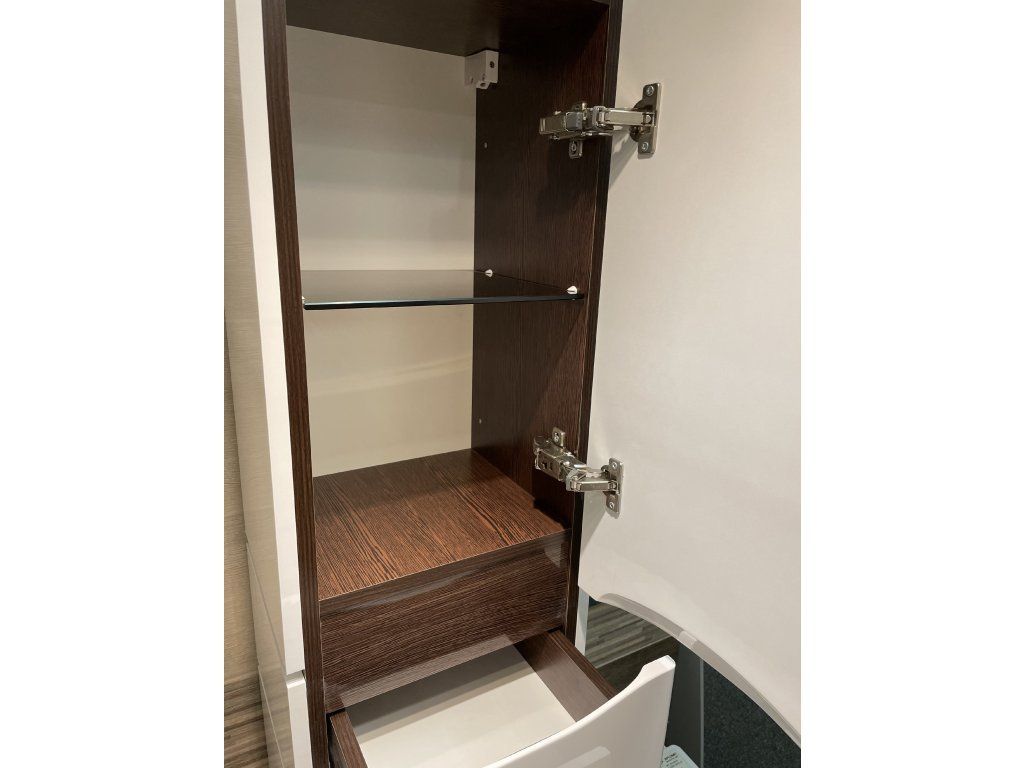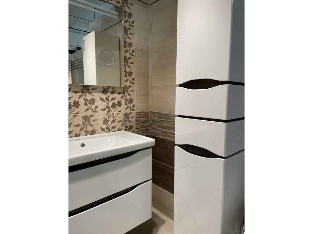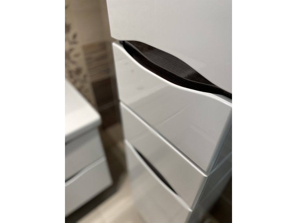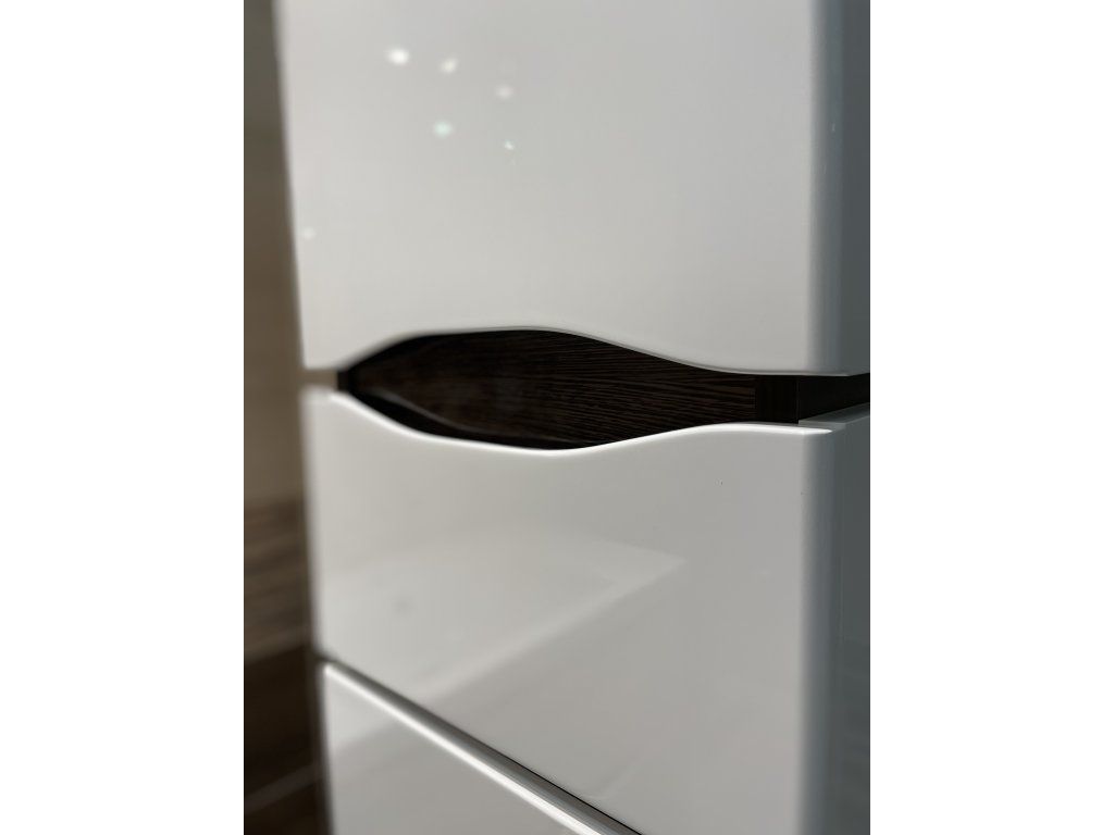 Nádherné řešení koupelnového sloupku, dodá koupelně opravdu na luxusním vzhledu, který především podporuje kombinace vysokého bílého lesku s lehkými detaily dekoru dřeva. Výhodou jsou lakované MDF desky, kdy zde není prostor pro riziko možného odlepení, jak se může stát při lepených. Řešení skrytých úchytů zabraňuje pocitu rušivých elementů, na které může být náročnější zákazník citlivý. Soft close dovírání ochrání šuplíky a dvířka před zvukově nepříjemným boucháním a odíráním se při zavírání.