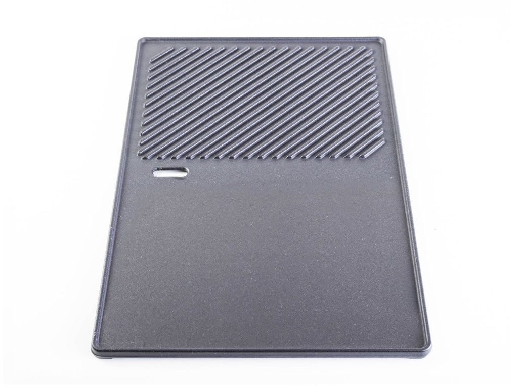 Litina patří mezi nejodolnější materiály, které se pro grilování používají. Je vysoce odolná proti vysokým teplotám a poškrábání. Na každé polovině litinového plátu máte k dispozici jiný druh povrchu. Jedna polovina je hladká a využijete ji především pro grilování nakrájené zeleniny, vajíček a sýrů. Druhá polovina s vroubky je určená pro správné grilování steaků, větších kusů zeleniny a ryb.