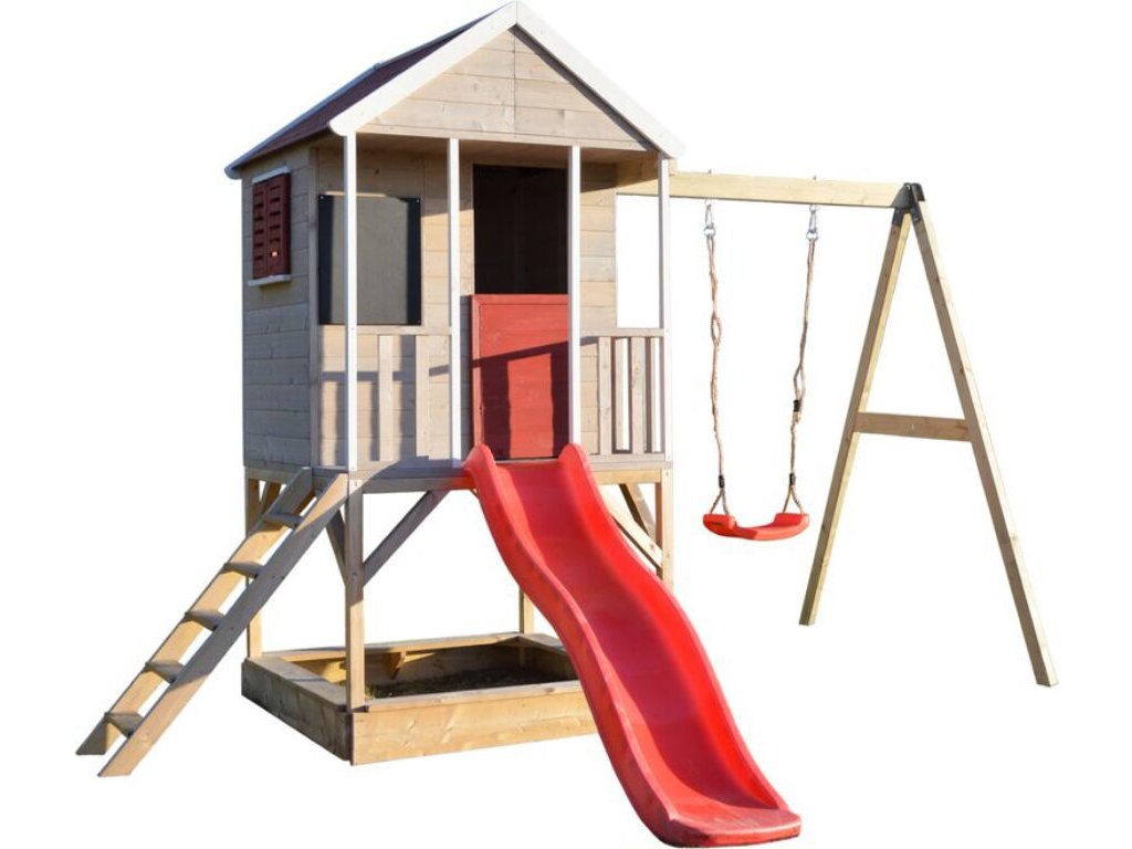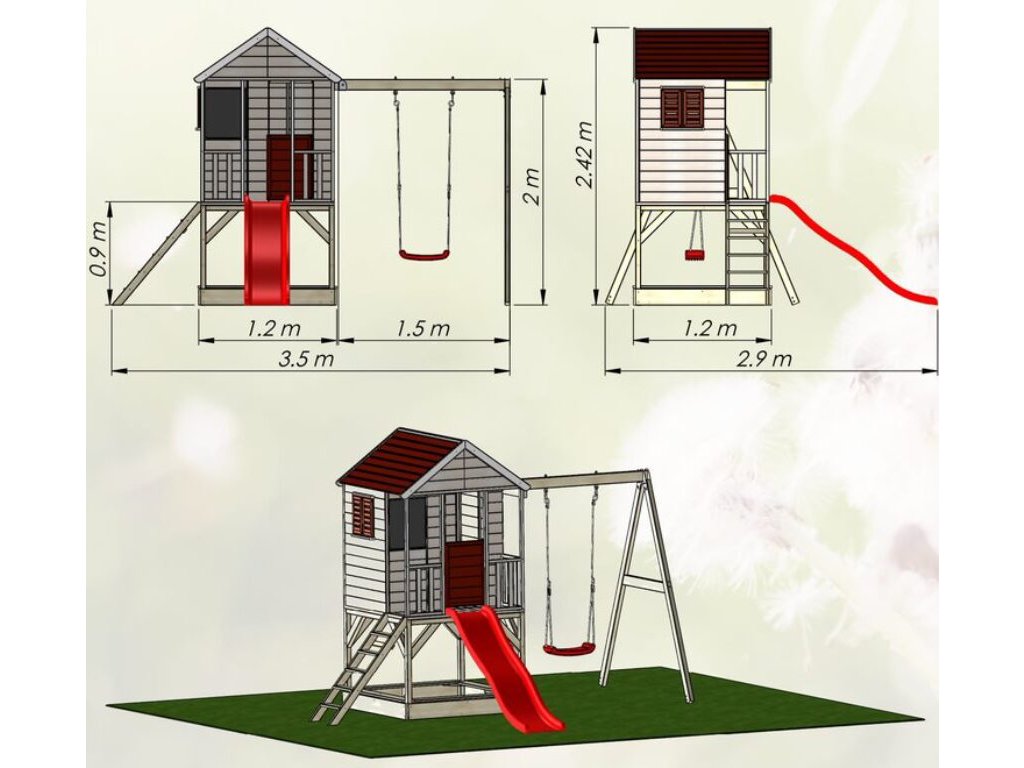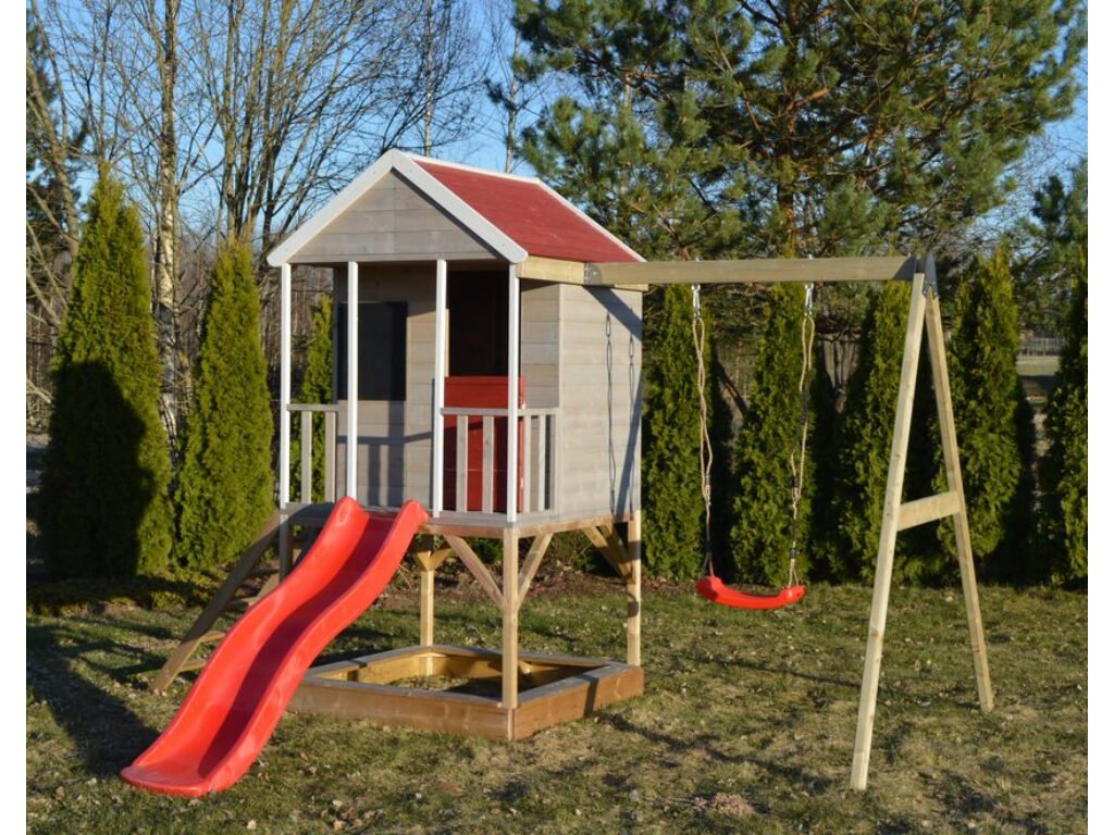 Dětský dřevěný domeček na vyvýšené podestě se skluzavkou a houpačkou. Dřevěná střecha. Ošetřeno ochranným nátěrem. Domeček dodáván v rozloženém stavu z prefabrikovaných dílů. Celé stěny a podlaha, které stačí sešroubovat k sobě. Pouze střecha se sestavuje z jednotlivých prken, které do sebe zapadají. Podesta a houpačka dodávána v rozloženém stavu - jednotlivé trámy. Včetně spojovacího materiálu.