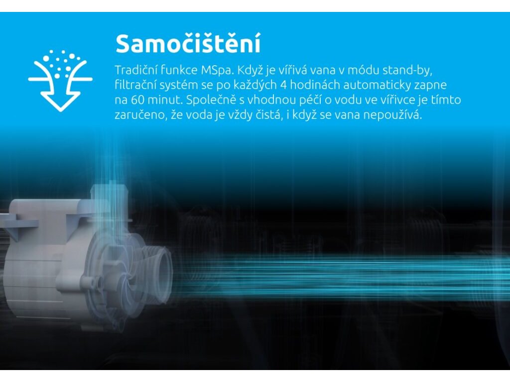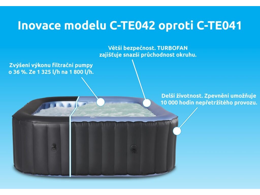 Rozměry 1 ks zabalného zboží: délka - 58,00 cm; šířka - 40,00 cm; výška - 64,00 cm; hmotnost: 23,00 kg.Nafukovací vířivka MSpa Tekapo C-TE042 má praktický tvar a bezvadně padne na jakoukoli terasu či zahradu. Tato mobilní vířivá vana pojme až 4 dospělé osoby zároveň! Je vybavena 108 vzduchovými tryskami a samozřejmě i účinným ohřevem vody. Uvnitř ovládací jednotky je zabudovaná mini sterilizační komora s UV LED lampou, která zajišťuje, že každá kapka vody v Mspa je pod neustálou ochranou. Vlastnosti mobilní vířivky MSpa Tekapo C-TE042: Barva skořepiny: modrá indigo Vnější materiál: RhinoTech Prémiové PVC - odolné a stálé, Grafitově šedá barva Patentovaný praktický čtvercový design UV lampa SMART filtrační systém ANTI-ICING Antibakteriální povrch Energy Saving Timer Whisper Quiet Tech Dálkové ovládání COMFORT UV lampa Uvnitř ovládací jednotky je zabudovaná mini sterilizační komora s UVC LED lampou, která zajišťuje, že každá kapka vody v Mspa je pod neustálou ochranou - bez ohledu na to, jestli se v ní zrovna koupou lidé nebo ne. Testy ukazují, že tato lampa dokáže za 4 hodiny zahubit 52% bakterií. UV LED lampa nemůže poškodit vaše oči ani pokožku, jelikož je kompletně uzavřena uvnitř čerpadla. Narozdíl od UVA nebo UVB záření UVC nemá vliv na životnost. Vlnová délka UVC záření je pečlivě nastavena tak. aby neovlivnila životnost ostatních částí vany. Spotřeba tohoto UVC systému je velice nízká. SMART filtrační systém Filtrační systém SMART vás upozorní na výměnu nebo vyčištění kartuše. ANTI-ICING Úplně nový systém ANTI-ICING bude neustále dohlížet na vaši vířivou vanu a hlídat bezpečnou úroveň teploty. Pokud teplota vody poklesne pod 1°C, ohřev se automaticky spustí, dokud teplota vody nestoupne na 3°C. Toto zabrání vodě v zamrznutí a ochrání tak cirkulační systém, čerpadlo a trubky před poškozením. Antibakteriální povrch Vnitřní folie vířivé vany obsahuje antibakteriální tkaninu, která uvolňuje baktericidní složku, která v souladu s ISO 22196:2011 standardem snižuje množení bakterií o 99%. Energy Saving Timer Chcete mít k dispozici hřejivou a útulnou vířivou vanu přesně kdy potřebujete? Žádný problém. Nyní si můžete nastavit čas, kdy se má vířivka vzbudit a začít se nahřívat. Za pomoci nově vyvinutého integrovaného čipu ovládací panel umožňuje uživateli nastavit čas, kdy se má zapnout vyhřívání po dobu následujících 99 hodin. Whisper Quiet Tech Na rozdíl od ostatních značek vířivých van, Mspa má velice tichý motor. Uložení ovládací jednotky uvnitř těla vířivky ve spojení s hluk absorbující pěnou dokáže redukovat hluk na úroveň nesrovnatelnou s konkurenčními produkty. Příslušenství SPA (obsaženo v balení vířivky): vířivá vana s kabelovým dálkovým ovladačem kryt vířivé vany s přezkami 2x filtrační vložka nafukovací hadice s tlakoměrem adaptér vypouštěcího ventilu sada záplat návod k použití Celkový výkon: 2100 W Ohřev: 1500 W Masážní vzduchovač: 600W Materiál vany: RhinoTech Prémiové PVC Rychlost ohřevu vody: 2°C - 2,5°C/hod Kapacita: 4 osoby Objem vody: 650 l Výška: 68 cm Vnější rozměry: 1,58 x 1,58 m Vnitřní rozměry: 1,18 x 1,18 m Tekapo modelový rok 2022 vs. 2021 (Tekapo C-TE041): Navýšení výkonu filtrační pumpy o 36 %: 1 325 l/h -> 1 800l/h Bezpečnější používání: díky konstrukci TURBOFAN cizí objekty rychleji projdou okruhem Delší životnost: nové zpevnění zajišťuje životnost 10.000 hodin v nepřetržitém provozu Připojení dalšího příslušenství K vířivce nejde připojit solární ohřev, chlorinátor ani písková filtrace.