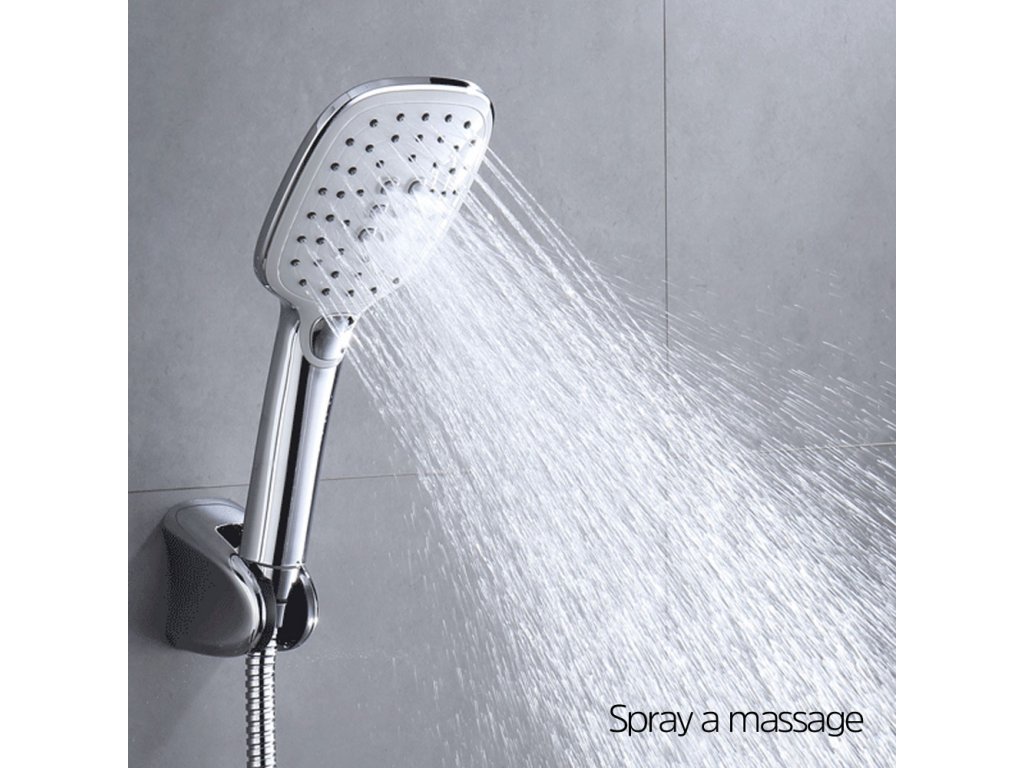 Sprchový set obsahuje baterii se sprchovou soupravou, třípolohovou ruční a hranatou talířovou sprchou. Sprcha je osazena standardním závitem 1/2" pro připojení na sprchovou hadici. Součástí je také bílá připojovací hadice o délce 150 cm.