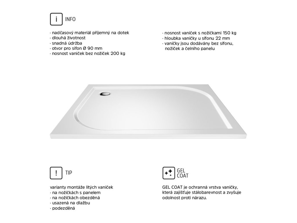 Sprchové vaničky z litého mramoru jsou opatřeny ochrannou vrstvou Gelcoat, která zajišťuje stálobarevnost a odolnost proti nárazu.