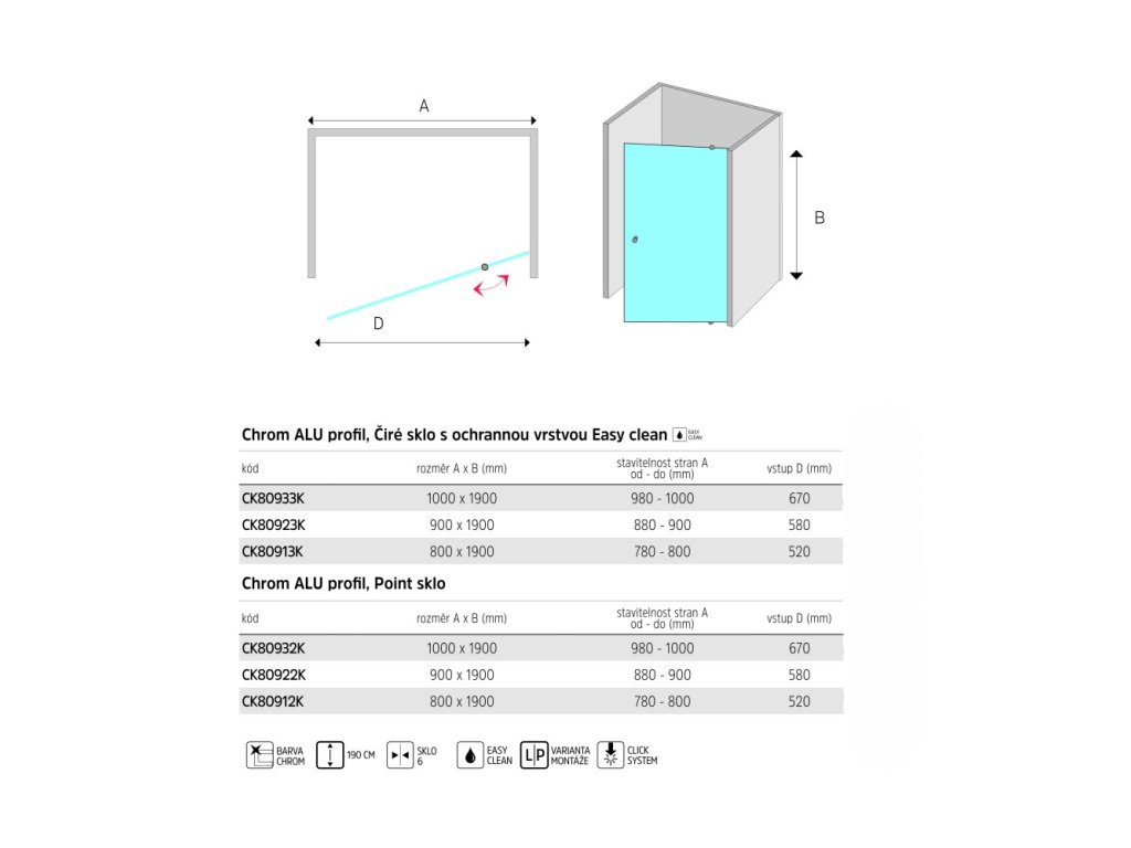 Hliníkové profily v barvě chrom, dveře pivotové, sklo Point, síla skla 6 mm, rozměr 1000 mm, výška 1900 mm.