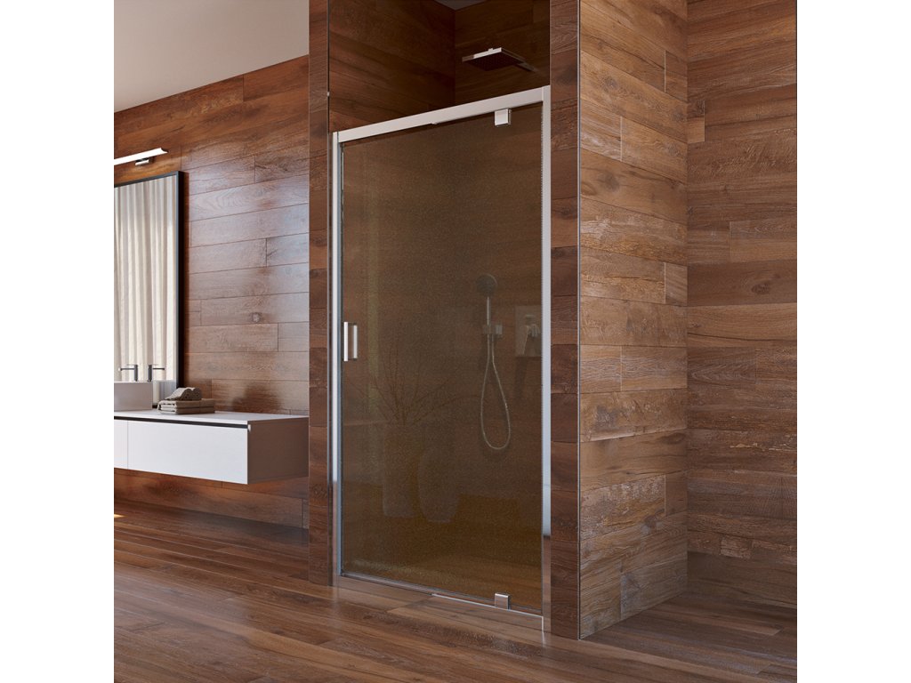 Hliníkové profily v barvě chrom, dveře pivotové, sklo Point, síla skla 6 mm, rozměr 800 mm, výška 1900 mm.