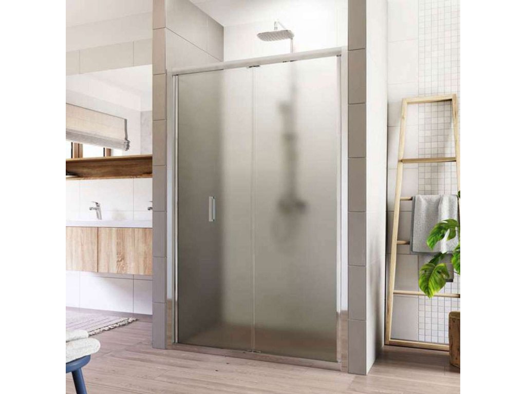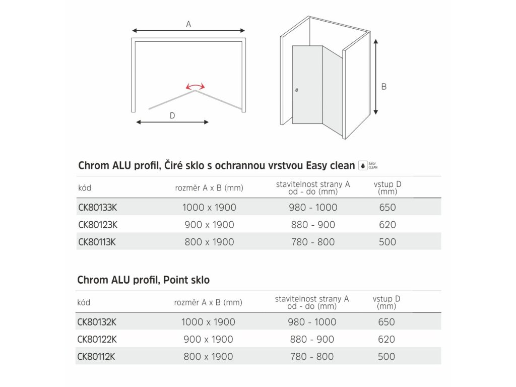 Hliníkové profily v barvě chrom, dveře zalamovací, sklo Point, síla skla 6 mm, rozměr 1000 mm, výška 1900 mm.
