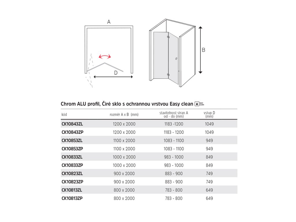 Hliníkové profily v barvě chrom, sklo Čiré, síla skla 6 mm, dveře, rozměr 1100 mm, výška 2000 mm.