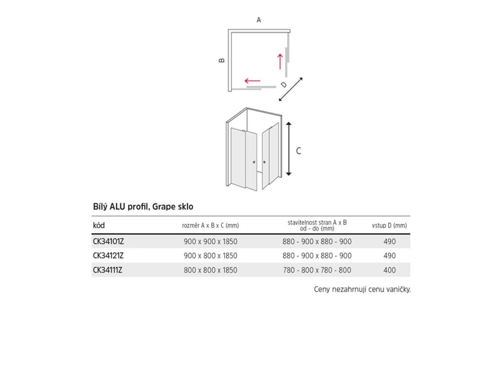 Hliníkové profily v bílé barvě, sklo Grape, síla skla 5 mm, čtverec, rozměr 800 x 800 mm, výška 1850 mm, elegantní madlo, dvoukolečkové ložiskové pojezdy.