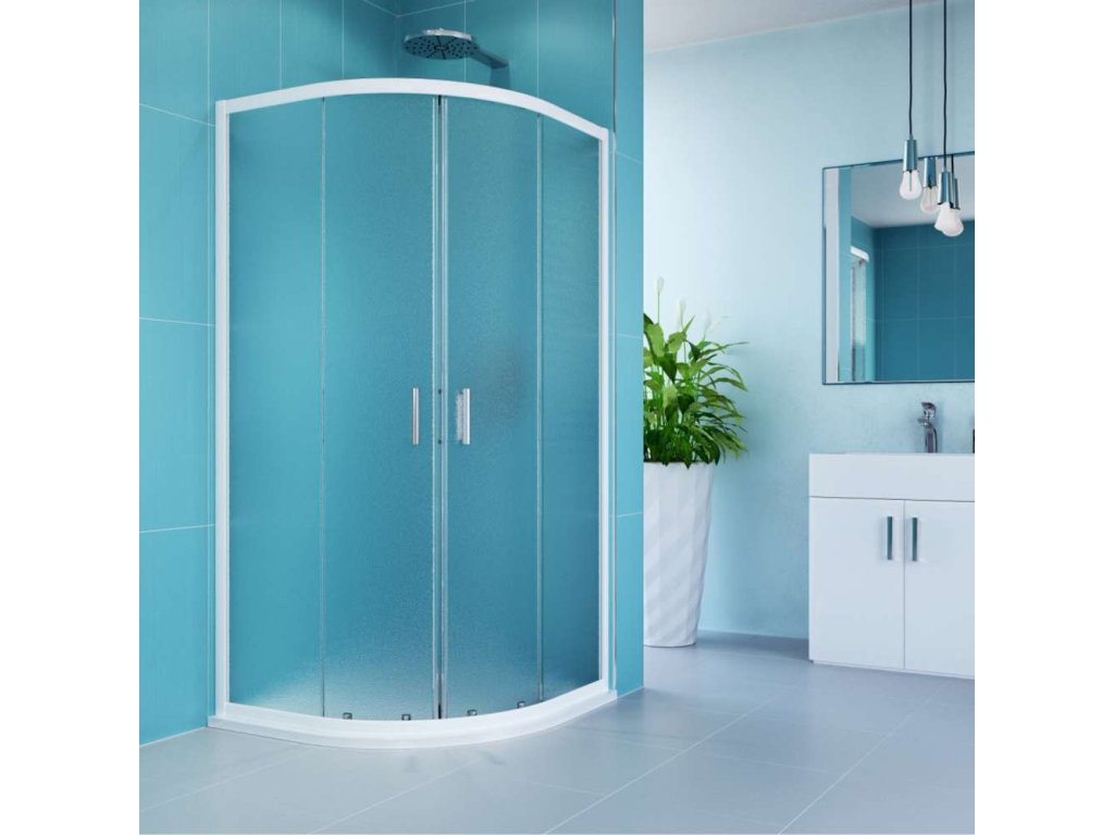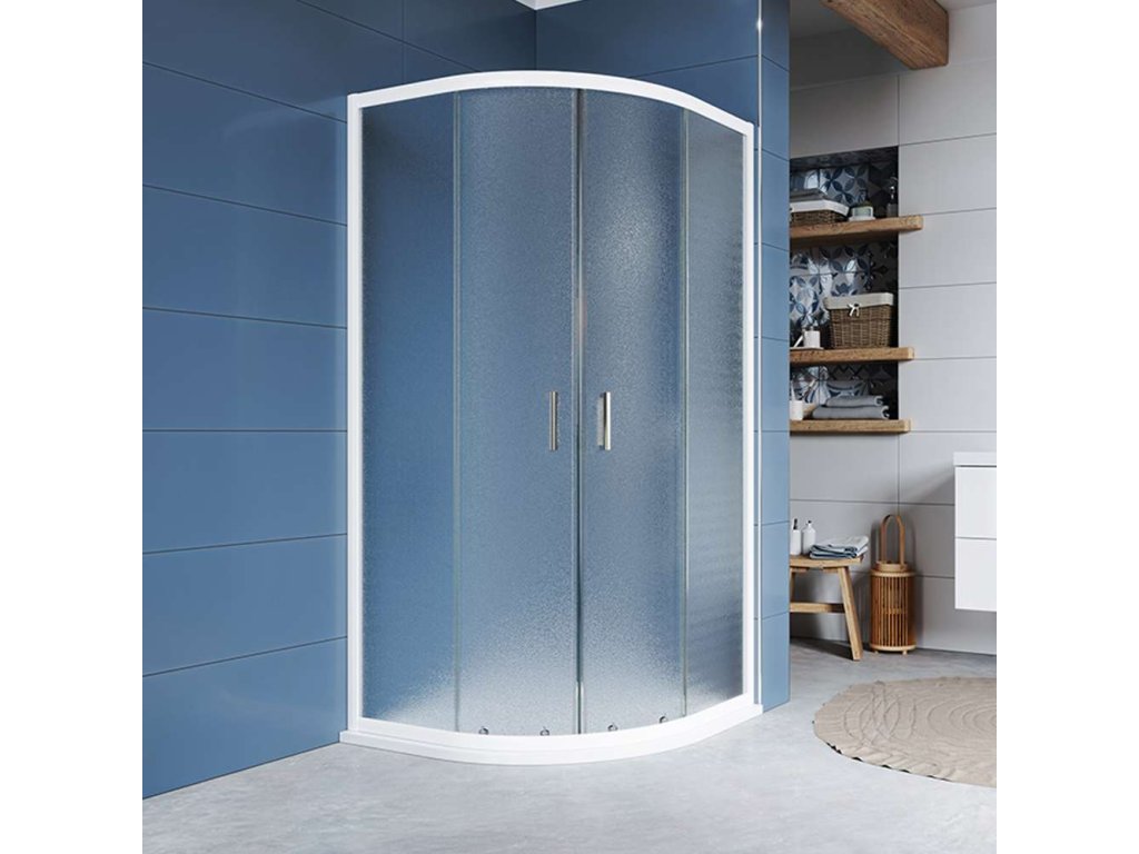 Hliníkové profily v bílé barvě, sklo Grape, síla skla 5 mm, čtvrtkruh, rozměr 900x900 mm, výška 1850 mm, R 550, elegantní madlo, dvoukolečkové ložiskové pojezdy.
