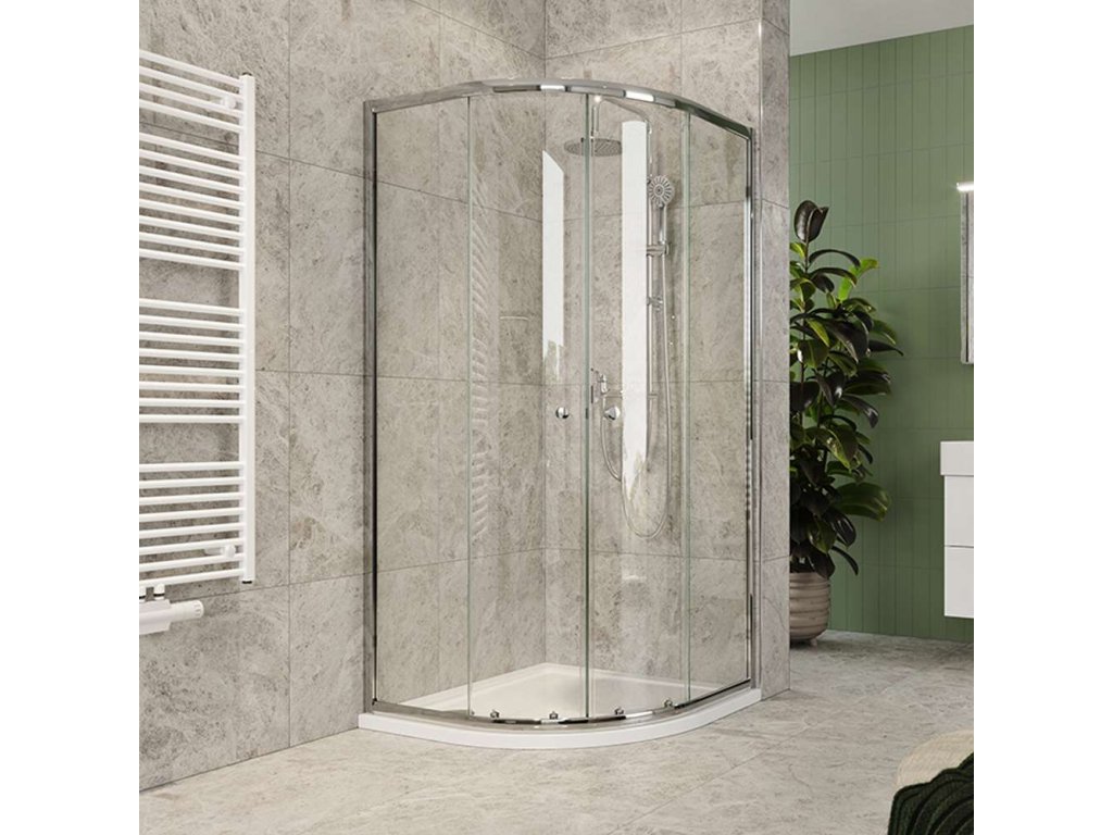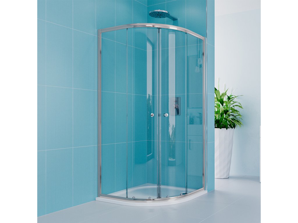 Hliníkové profily v barvě chrom, sklo Čiré, síla skla 4 mm, čtvrtkruh rozměr 900x900 mm, výška 1850 mm, R 550.