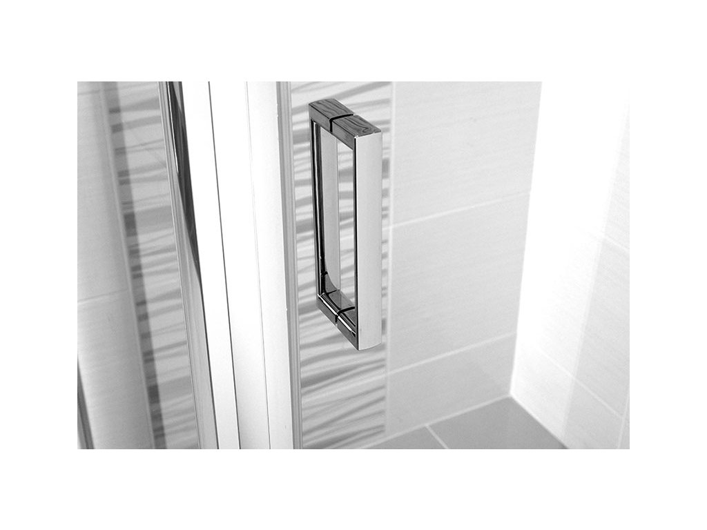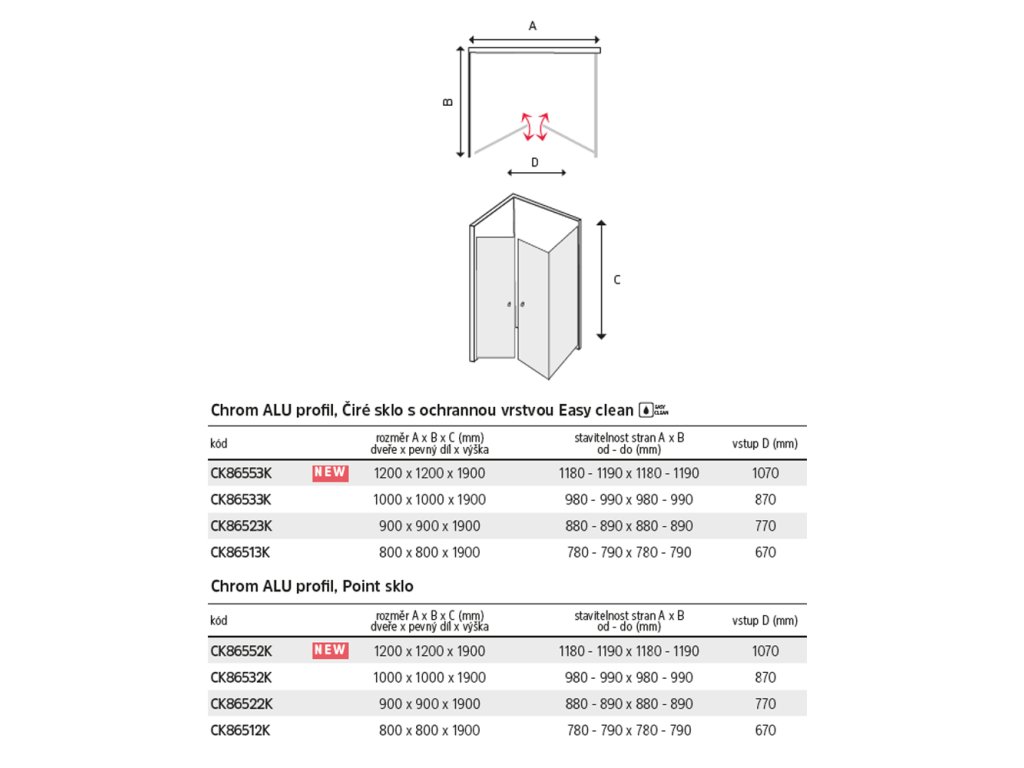 Hliníkové profily v barvě chrom, lítací dveře a pevný díl, sklo Point, síla skla 6 mm, čtverec, 1000 (dveře) x 1000 (pevný díl), výška 1900 mm.