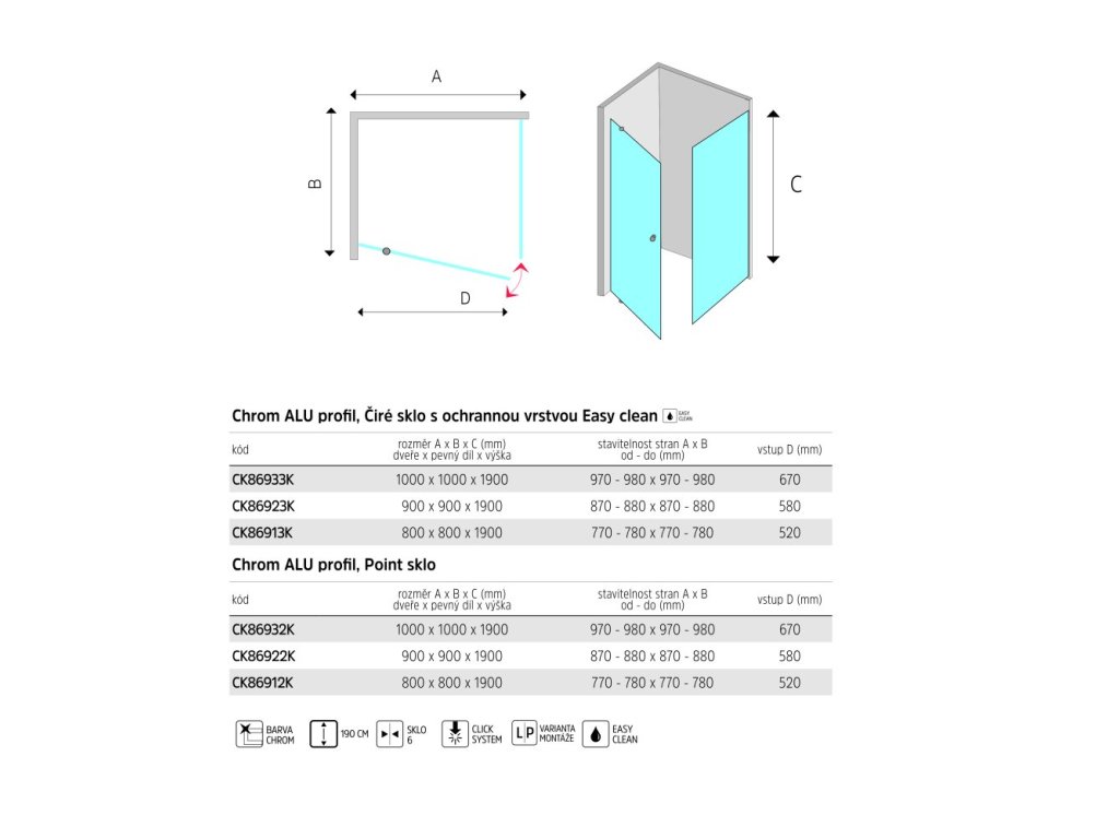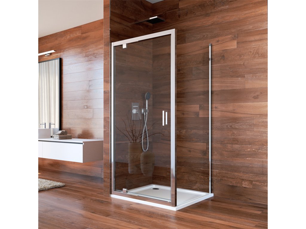 Hliníkové profily v barvě chrom, pivotové jednokřídlé dveře a pevný díl, sklo Čiré, síla skla 6 mm, čtverec, 1000 (dveře) x 1000 (pevný díl), výška 1900 mm.
