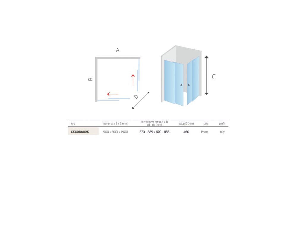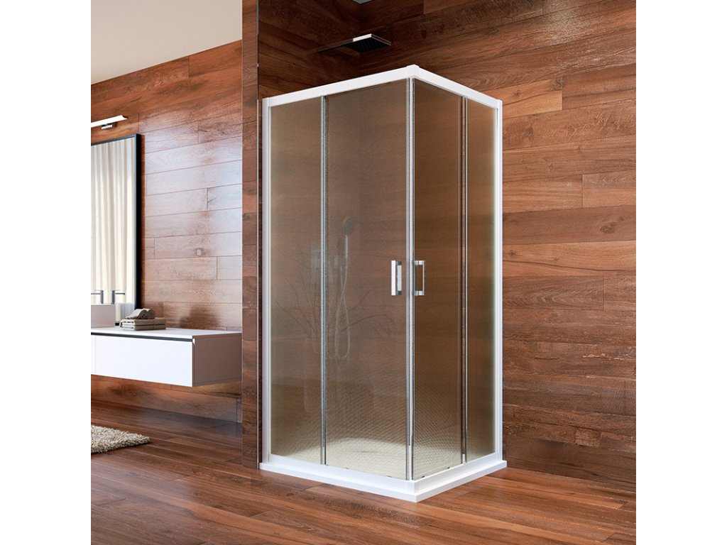 Hliníkové profily v barvě bílé, dveře posuvné, sklo Point, síla skla 6 mm, čtverec, rozměr 900 x 900 mm, výška 1900 mm.