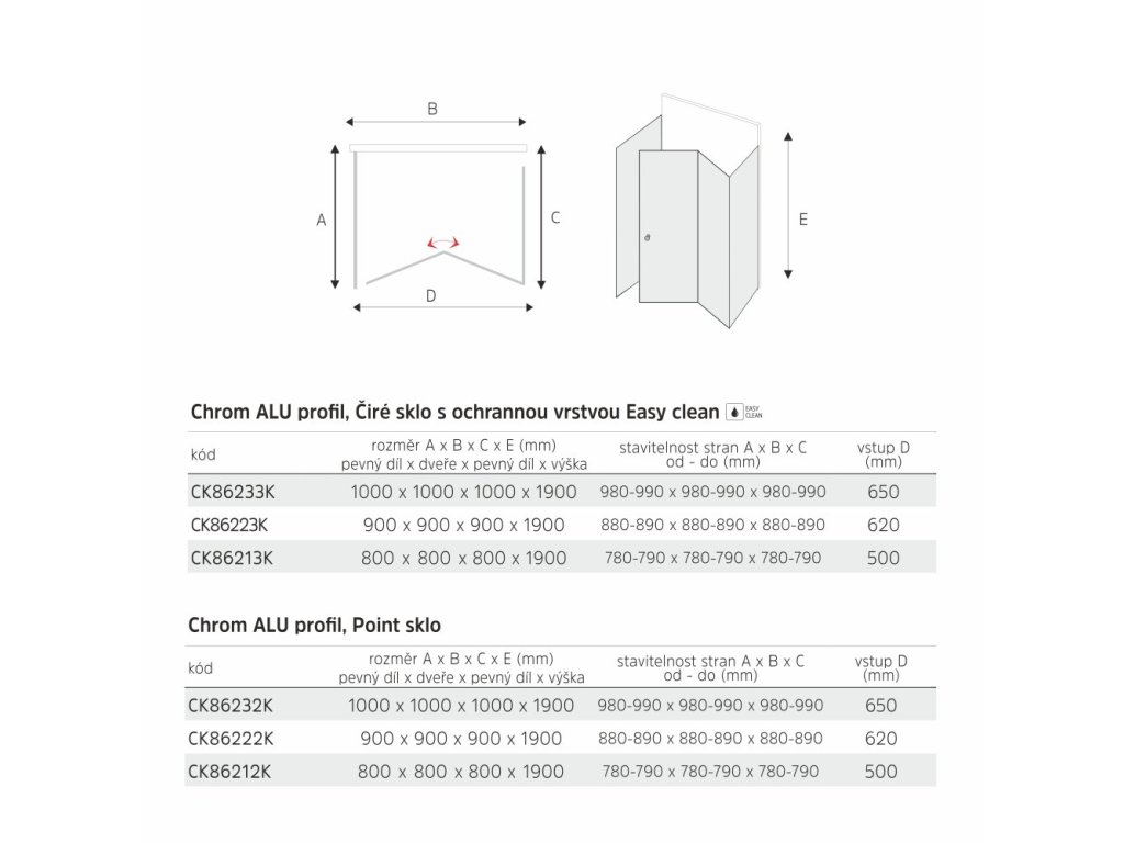 Hliníkové profily v barvě chrom, zalamovací dveře a dva pevné díly, sklo Point, síla skla 6 mm, čtverec, rozměr 800x800x800 mm, výška 1900 mm.