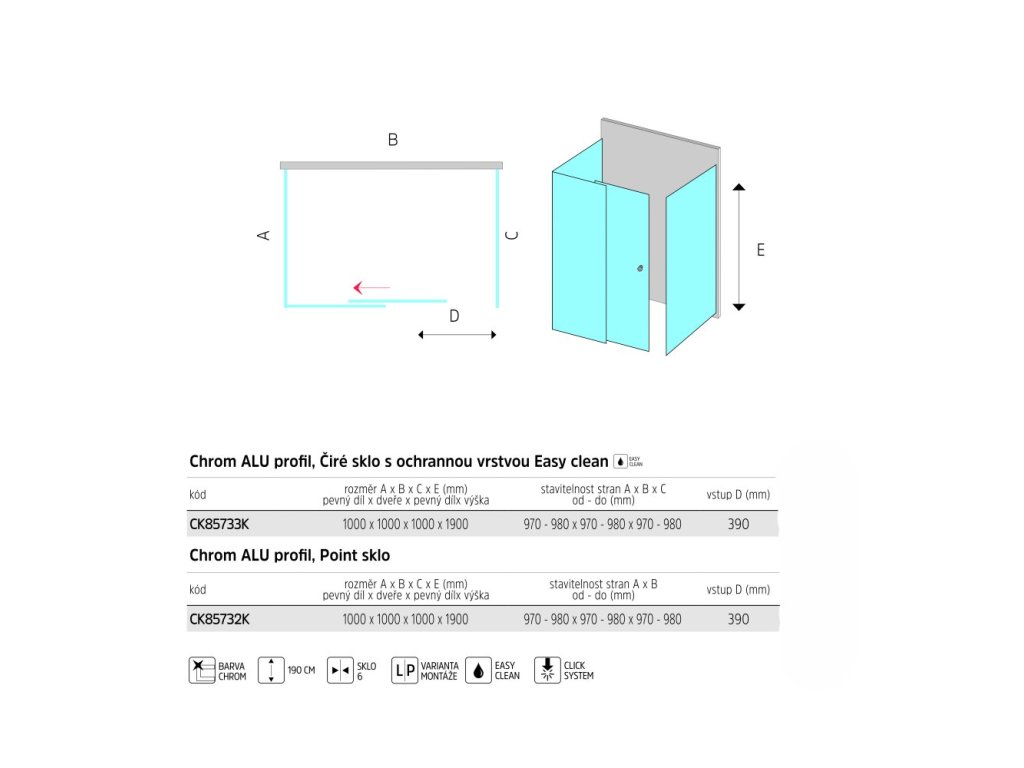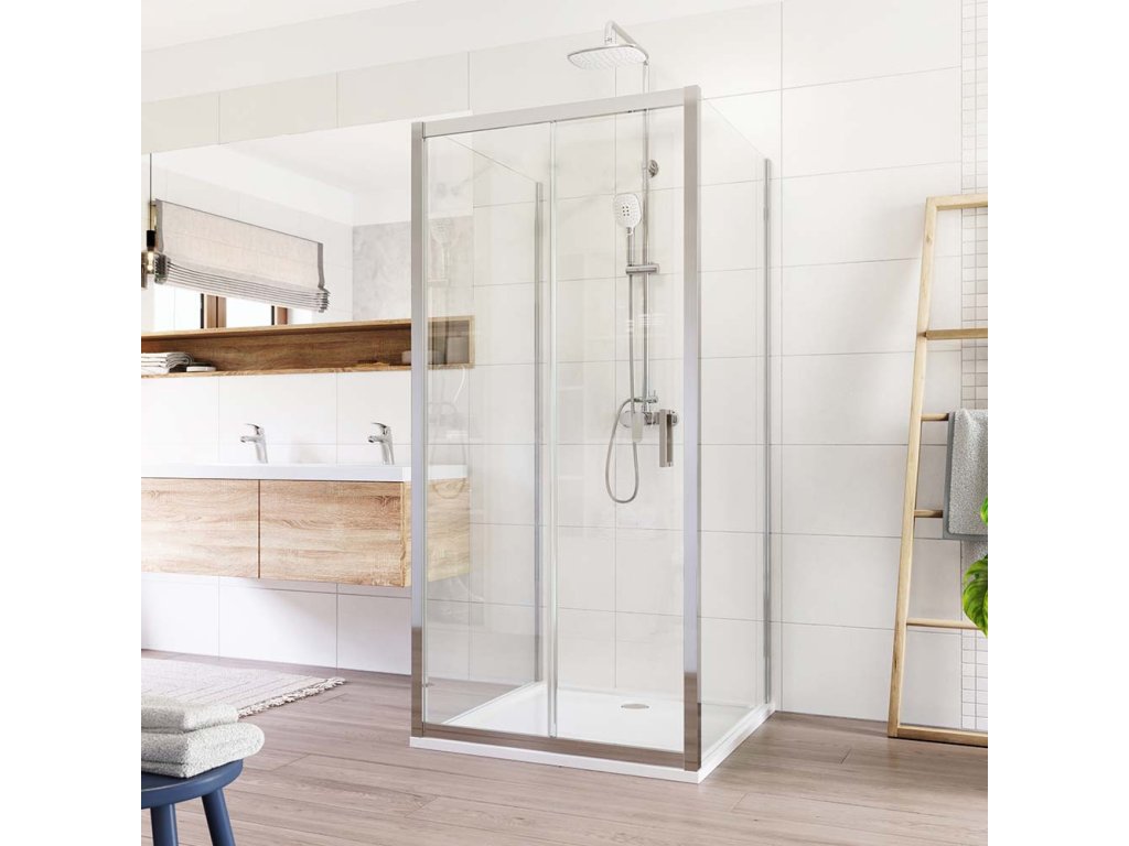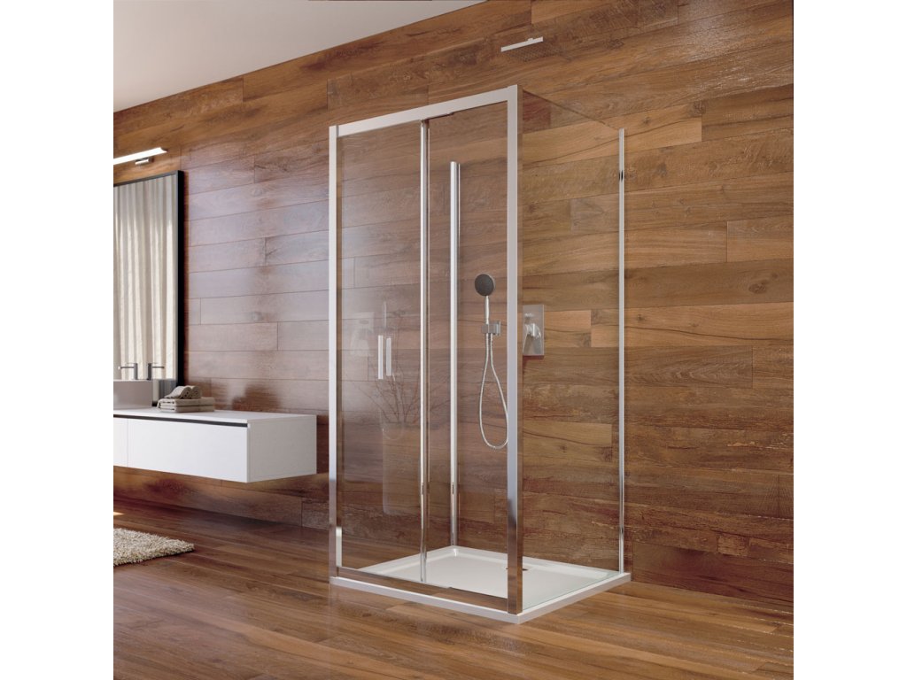 Hliníkové profily v barvě chrom, zasunovací dveře a dva pevné díly, sklo Čiré, síla skla 6 mm, čtverec, rozměr 1000x1000x1000 mm, výška 1900 mm.