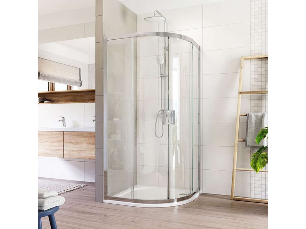 Hliníkové profily v barvě chrom, dveře posuvné, sklo Čiré, síla skla 6 mm, čtvrtkruh, rozměr 800 x 800 mm, výška 1900 mm