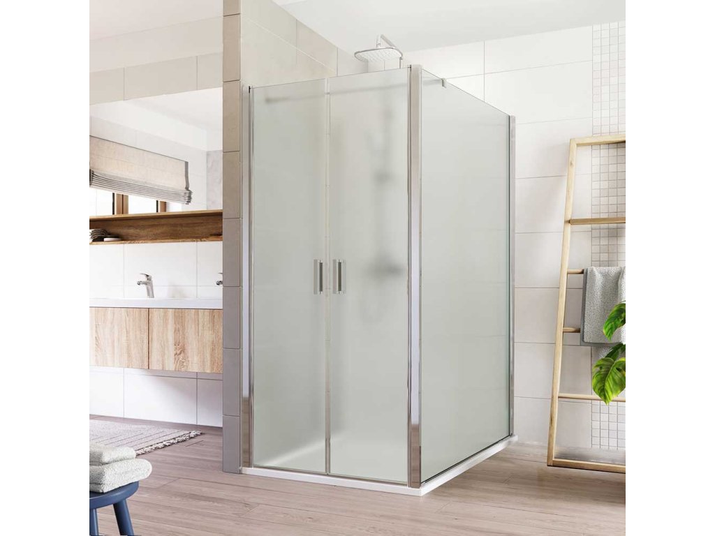 Hliníkové profily v barvě chrom, lítací dveře a pevný díl, sklo Point, síla skla 6 mm, obdélník, 1100 (dveře) x 1200 (pevný díl), výška 1900 mm.