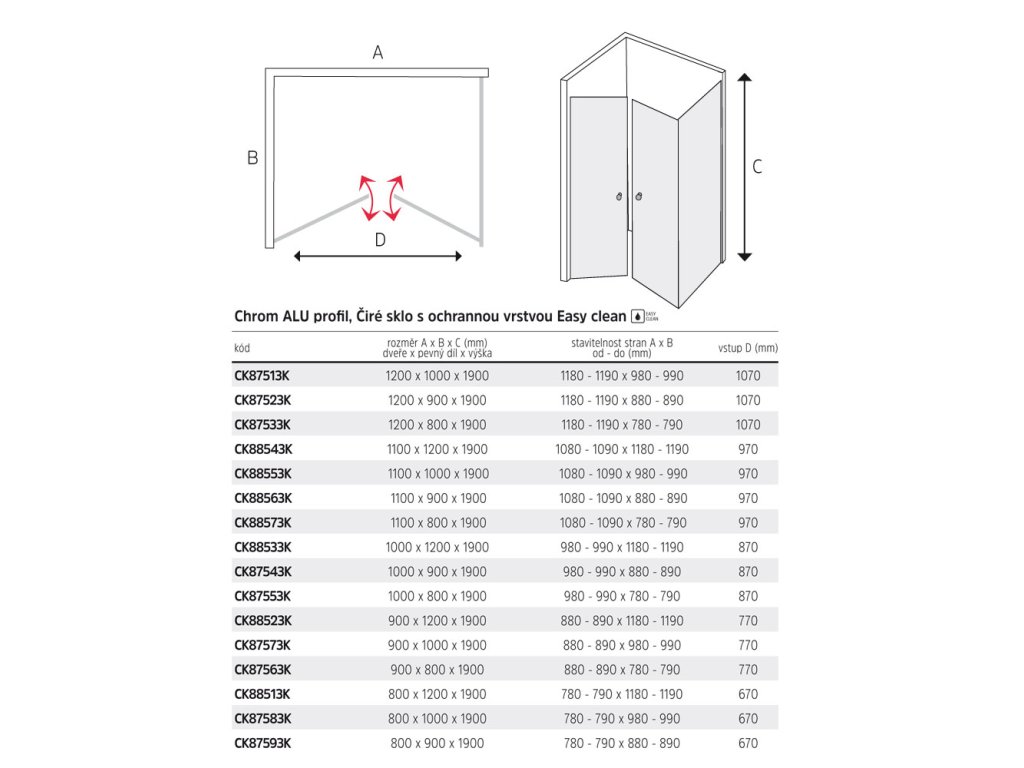 Hliníkové profily v barvě chrom, lítací dveře a pevný díl, sklo Čiré, síla skla 6 mm, obdélník, 1200 (dveře) x 900 (pevný díl), výška 1900 mm.