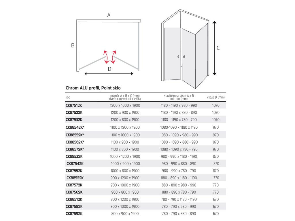 Hliníkové profily v barvě chrom, lítací dveře a pevný díl, sklo Point, síla skla 6 mm, obdélník, 800 (dveře) x 900 (pevný díl), výška 1900 mm.