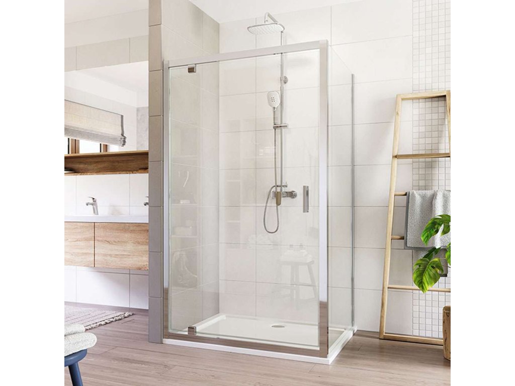 Hliníkové profily v barvě chrom, pivotové jednokřídlé dveře a pevný díl, sklo Čiré, síla skla 6 mm, obdélník, 1000 (dveře) x 800 (pevný díl), výška 1900 mm.