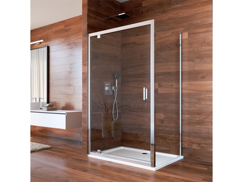 Hliníkové profily v barvě chrom, pivotové jednokřídlé dveře a pevný díl, sklo Čiré, síla skla 6 mm, obdélník, 1000 (dveře) x 900 (pevný díl), výška 1900 mm.