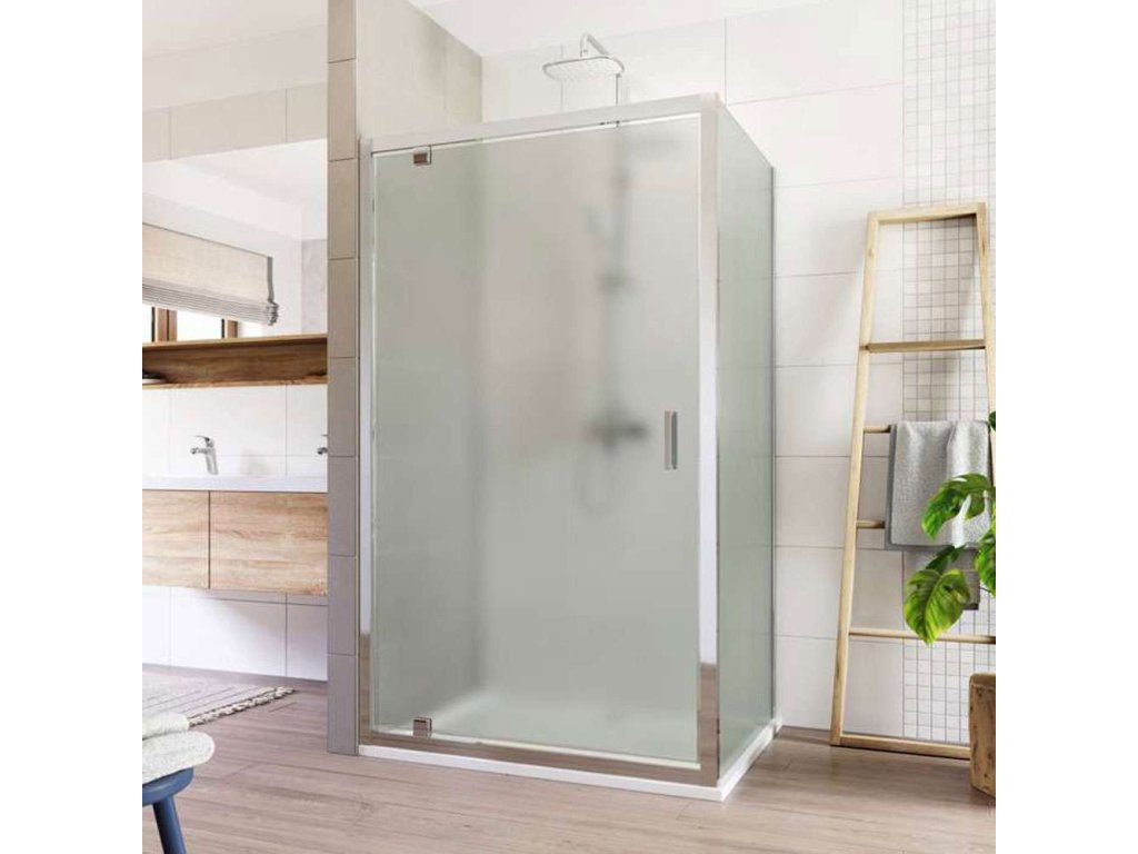 Hliníkové profily v barvě chrom, pivotové jednokřídlé dveře a pevný díl, sklo Point, síla skla 6 mm, obdélník, 800 (dveře) x 1000 (pevný díl), výška 1900 mm.