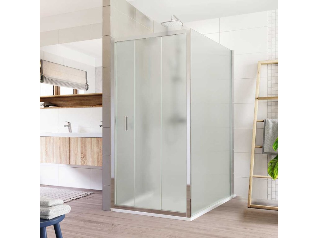 Hliníkové profily v barvě chrom, trojdílné zasunovací dveře a pevný díl, sklo Point, síla skla 6 mm, obdélník, 800 (dveře) x 1000 (pevný díl), výška 1900 mm.
