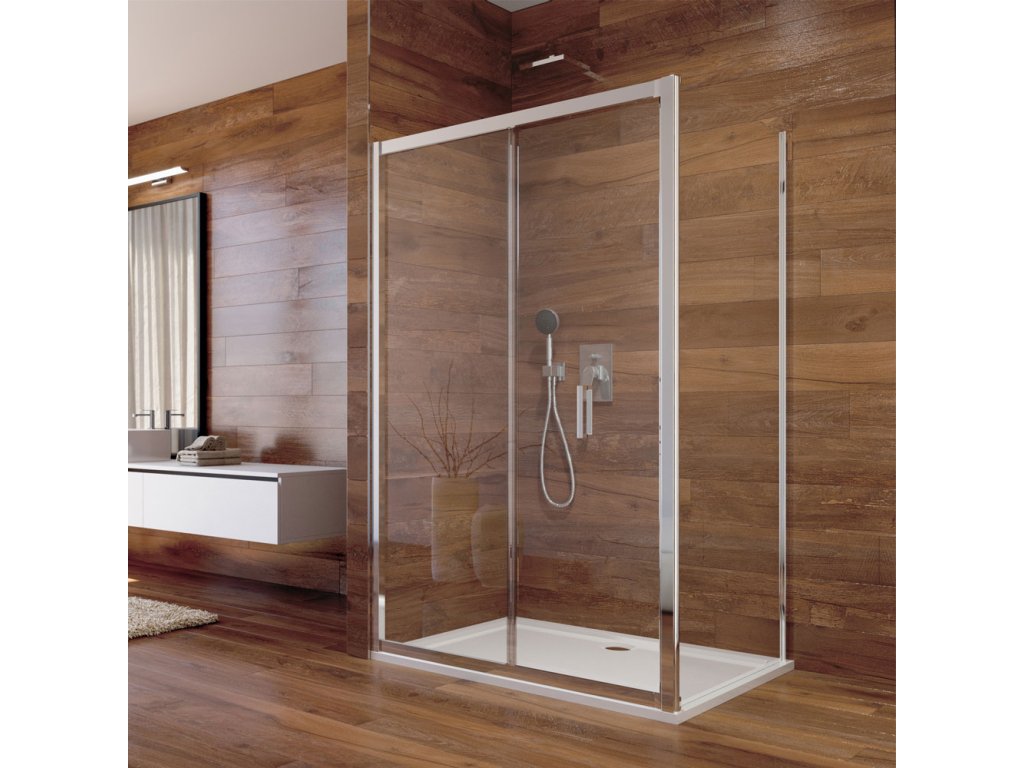 Hliníkové profily v barvě chrom, zalamovací dveře a pevný díl, sklo Point, síla skla 6 mm, obdélník, 1000 (dveře) x 800 (pevný díl), výška 1900 mm.