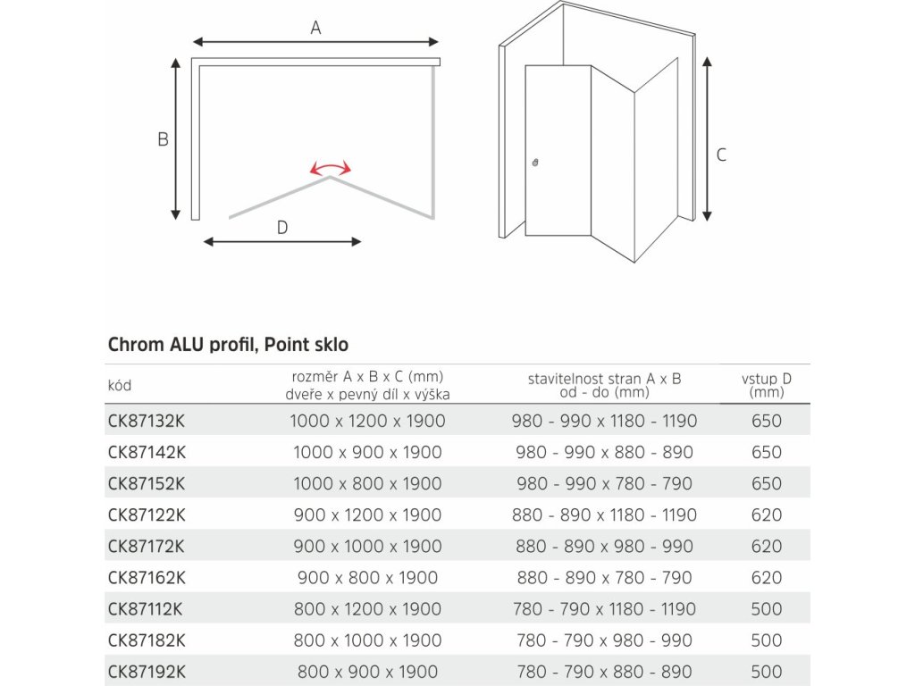 Hliníkové profily v barvě chrom, zalamovací dveře a pevný díl, sklo Point, síla skla 6 mm, obdélník, 800 (dveře) x 900 (pevný díl), výška 1900 mm.