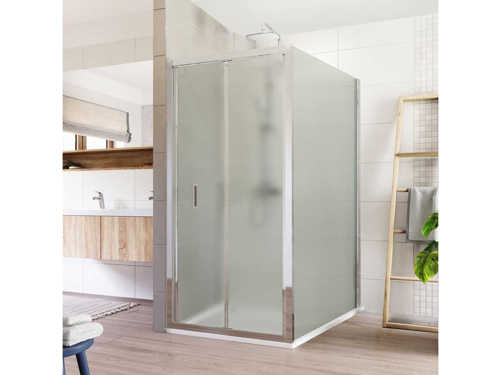 Hliníkové profily v barvě chrom, zalamovací dveře a pevný díl, sklo Point, síla skla 6 mm, obdélník, 900 (dveře) x 1000 (pevný díl), výška 1900 mm.