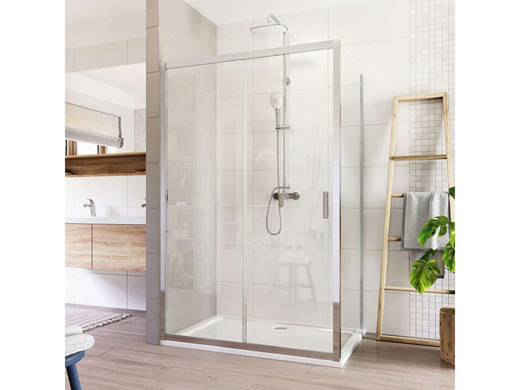 Hliníkové profily v barvě chrom, zasunovací dveře a pevný díl, sklo Čiré, síla skla 6 mm, obdélník, 1100 (dveře) x 900 (pevný díl), výška 1900 mm.