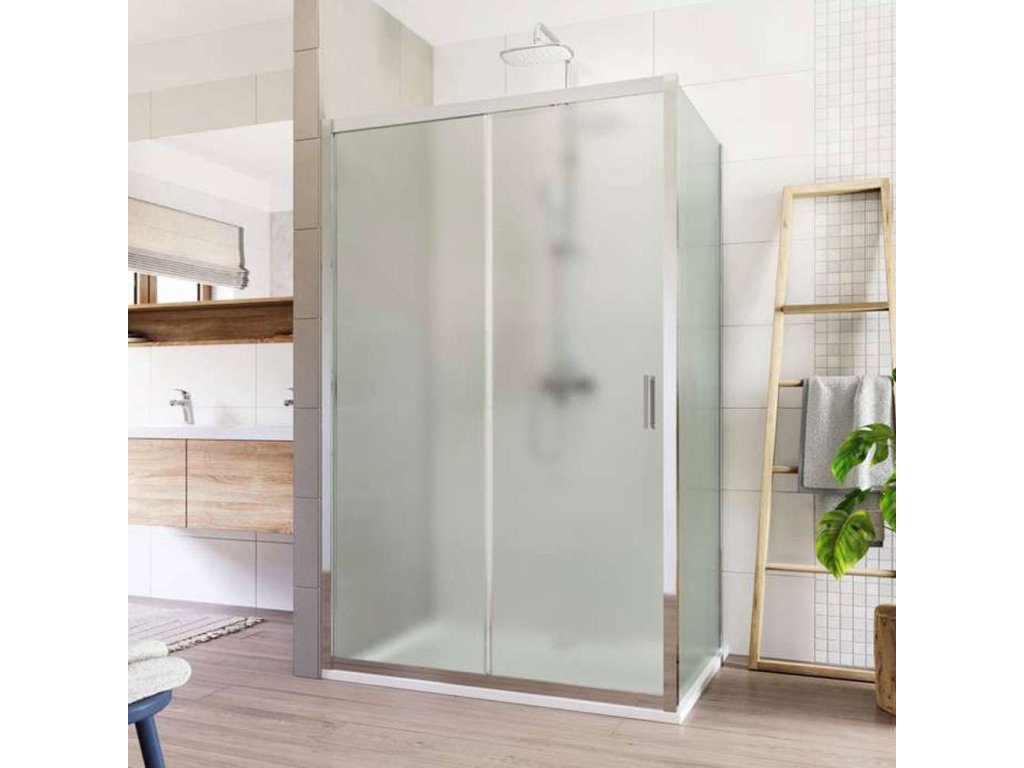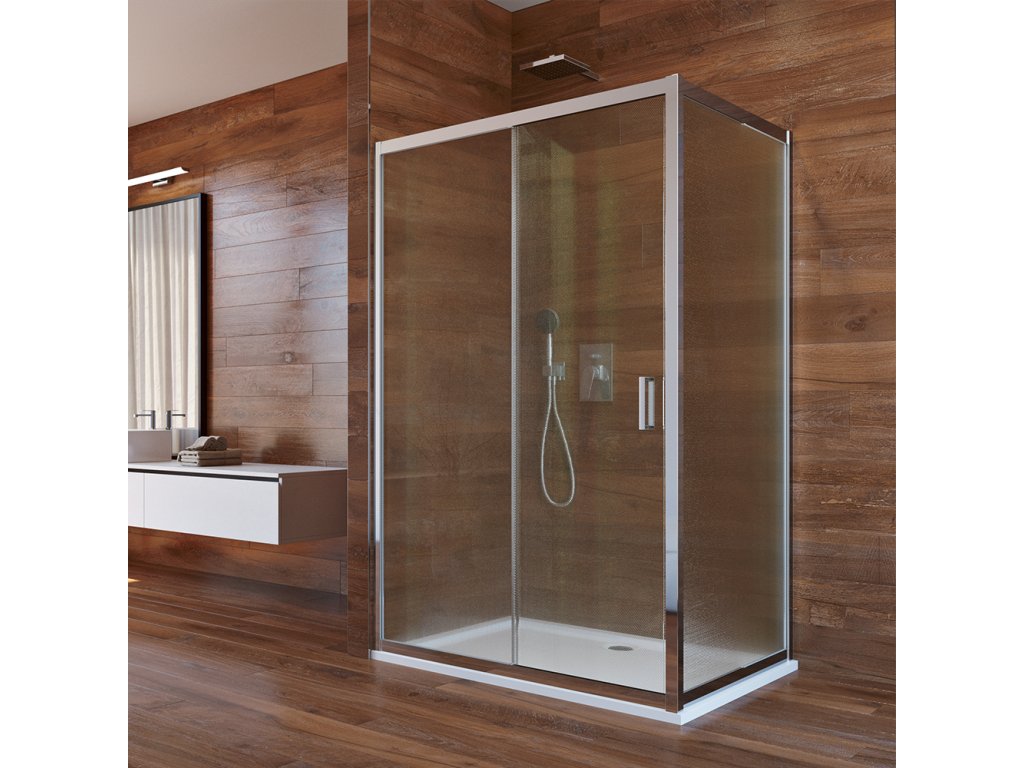 Hliníkové profily v barvě chrom, zasunovací dveře a pevný díl, sklo Point, síla skla 6 mm, obdélník, 1200 (dveře) x 1000 (pevný díl), výška 1900 mm.