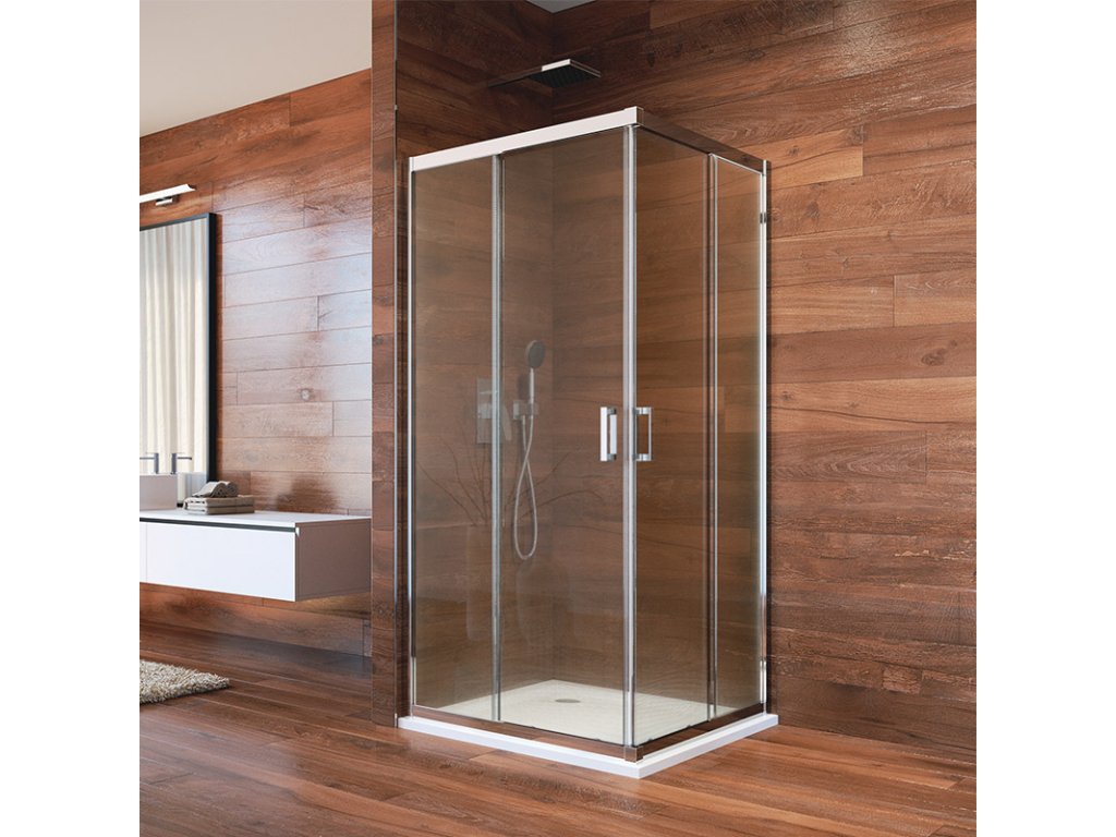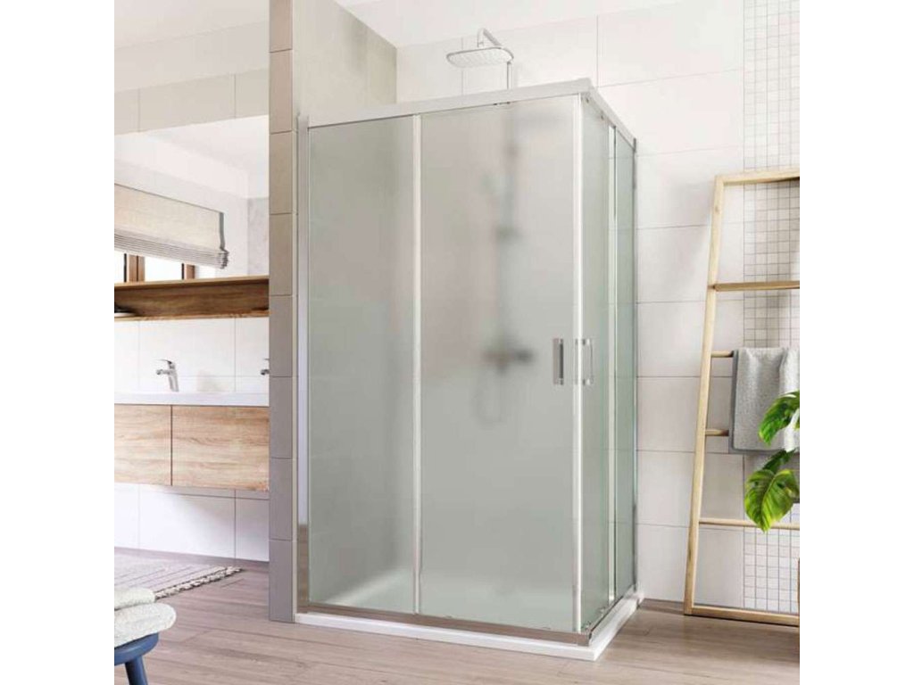 Hliníkové profily v barvě chrom, sklo Point, síla skla 6 mm, obdélník, rohový vstup, rozměr 1200 x 800 mm, výška 1900 mm