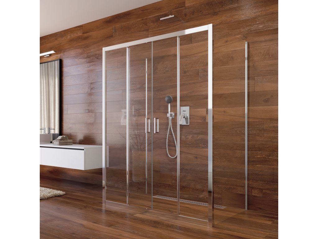 Hliníkové profily v barvě chrom, zasunovací dveře a dva pevné díly, sklo Čiré, síla skla 6 mm, obdélník, rozměr 800x1400x800 mm, výška 1900 mm.