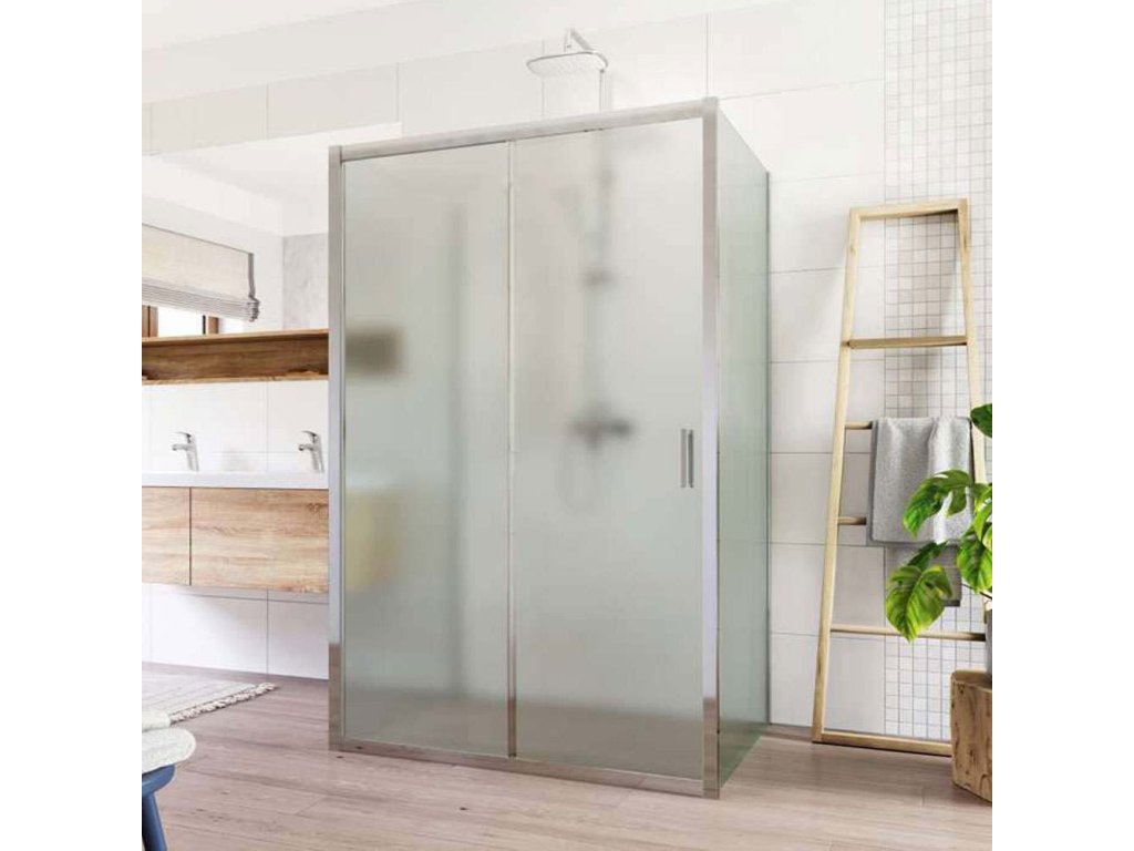 Hliníkové profily v barvě chrom, zasunovací dveře a dva pevné díly, sklo Point, síla skla 6 mm, obdélník, rozměr 800x1000x800 mm, výška 1900 mm.