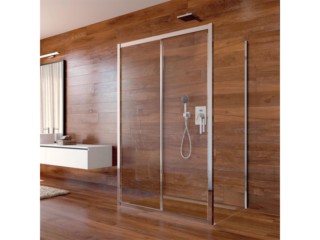 Hliníkové profily v barvě chrom, zasunovací dveře a dva pevné díly, sklo Čiré, síla skla 6 mm, obdélník, rozměr 900x1000x900 mm, výška 1900 mm.