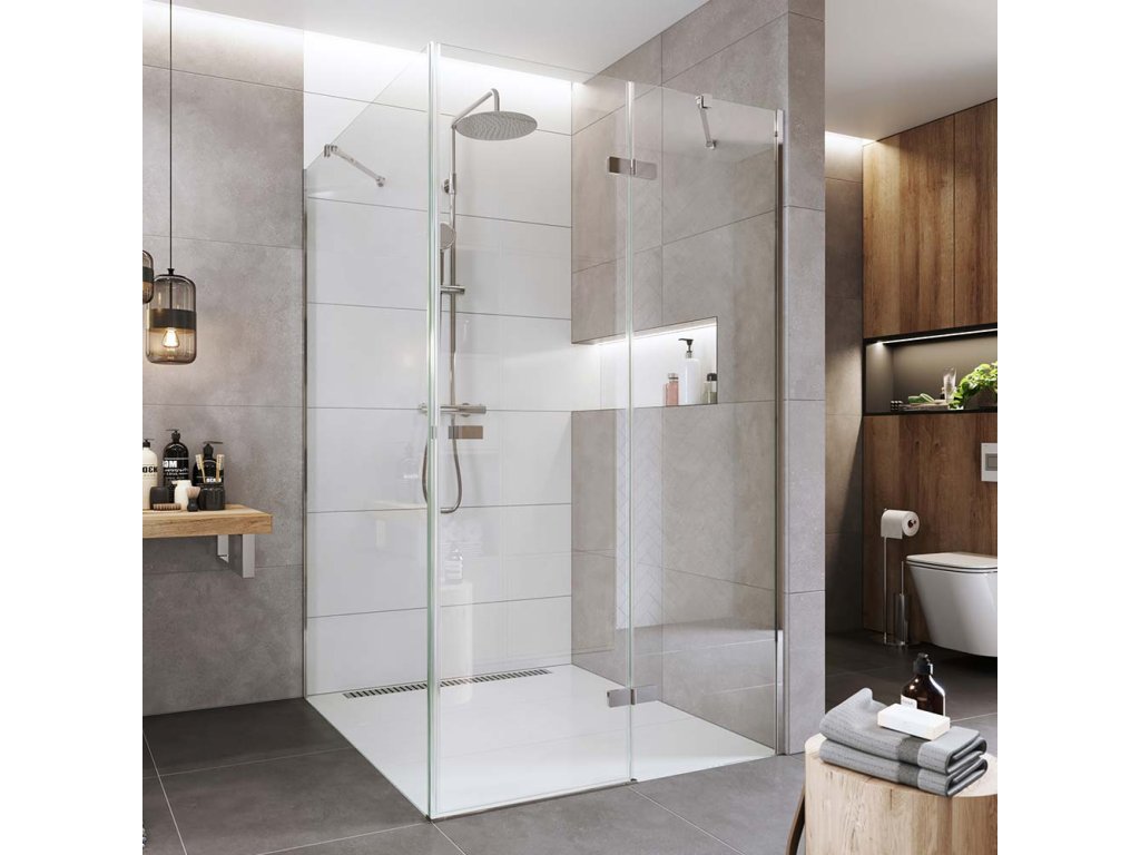 Hliníkové profily v barvě chrom, sklo Čiré, síla skla 8/6 mm, čtverec, 1000 (dveře) x 1000 (pevný díl), výška 2000 mm.