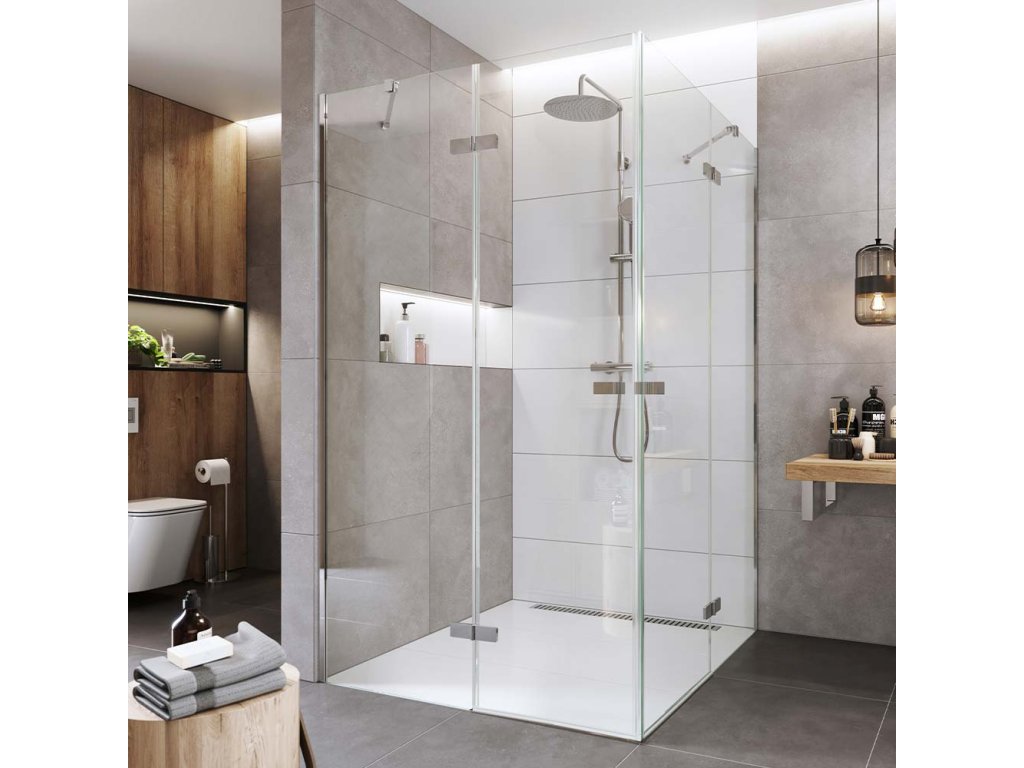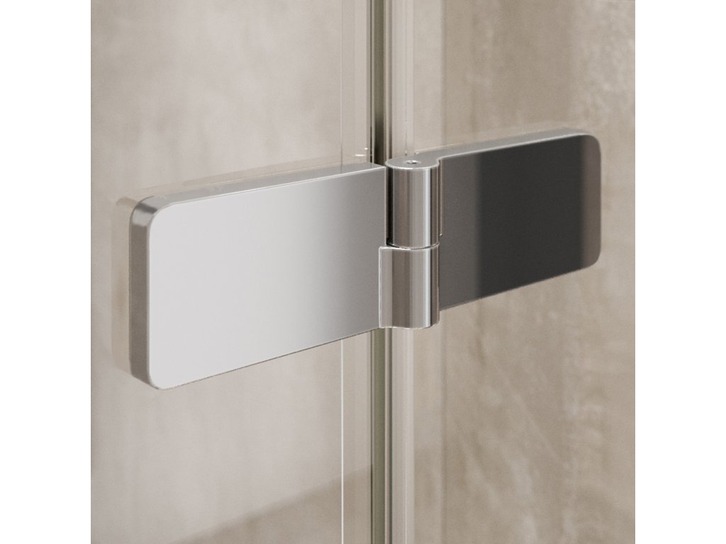 Hliníkové profily v barvě chrom, sklo Čiré, síla skla 6/6 mm, čtverec, rozměr 1100x1100 mm, výška 2000 mm, vstup rohem.