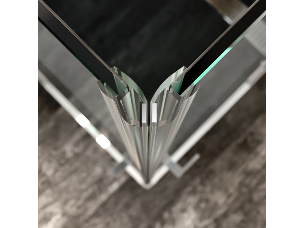 Hliníkové profily v barvě chrom, sklo Čiré, síla skla 6/6 mm, čtverec, rozměr 1200x1200 mm, výška 2000 mm, vstup rohem.