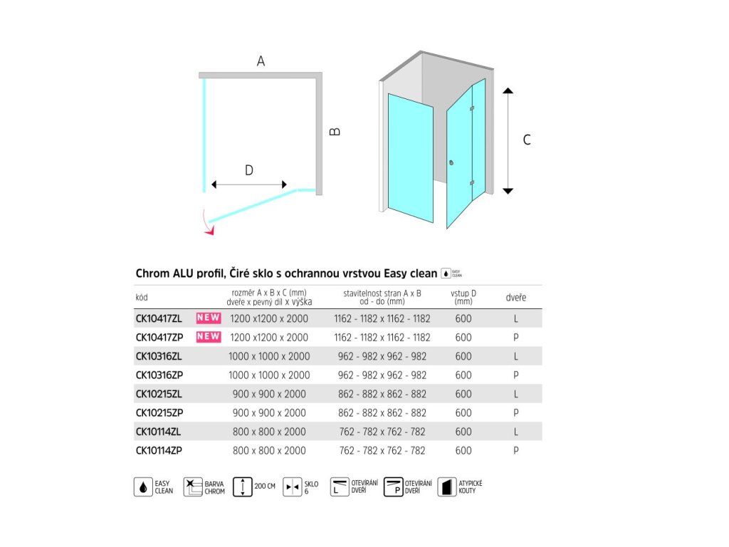 Hliníkové profily v barvě chrom, sklo Čiré, síla skla 6/8 mm, obdélník, 1200 (dveře) x 1200 (pevný díl), výška 2000 mm.