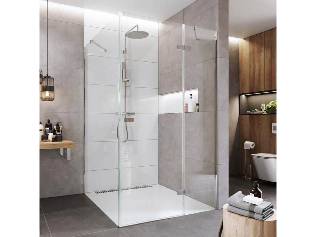 Hliníkové profily v barvě chrom, sklo Čiré, síla skla 6/6 mm, čtverec, 800 (dveře) x 800 (pevný díl), výška 2000 mm.