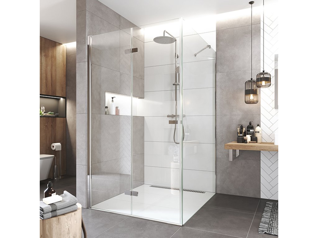 Hliníkové profily v barvě chrom, sklo Čiré, síla skla 6 mm, obdélník, 800 (dveře) x 800 (pevný díl), výška 2000 mm.