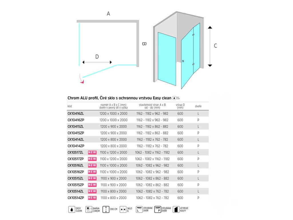 Hliníkové profily v barvě chrom, sklo Čiré, síla skla 6/8 mm, obdélník, 1000 (dveře) x 1200 (pevný díl), výška 2000 mm.