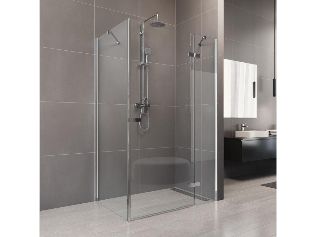 Hliníkové profily v barvě chrom, sklo Čiré, síla skla 6/8 mm, obdélník, 1100 (dveře) x 1000 (pevný díl), výška 2000 mm.