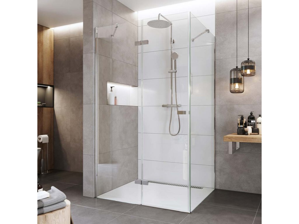 Hliníkové profily v barvě chrom, sklo Čiré, síla skla 6/8 mm, obdélník, 1100 (dveře) x 1200 (pevný díl), výška 2000 mm.