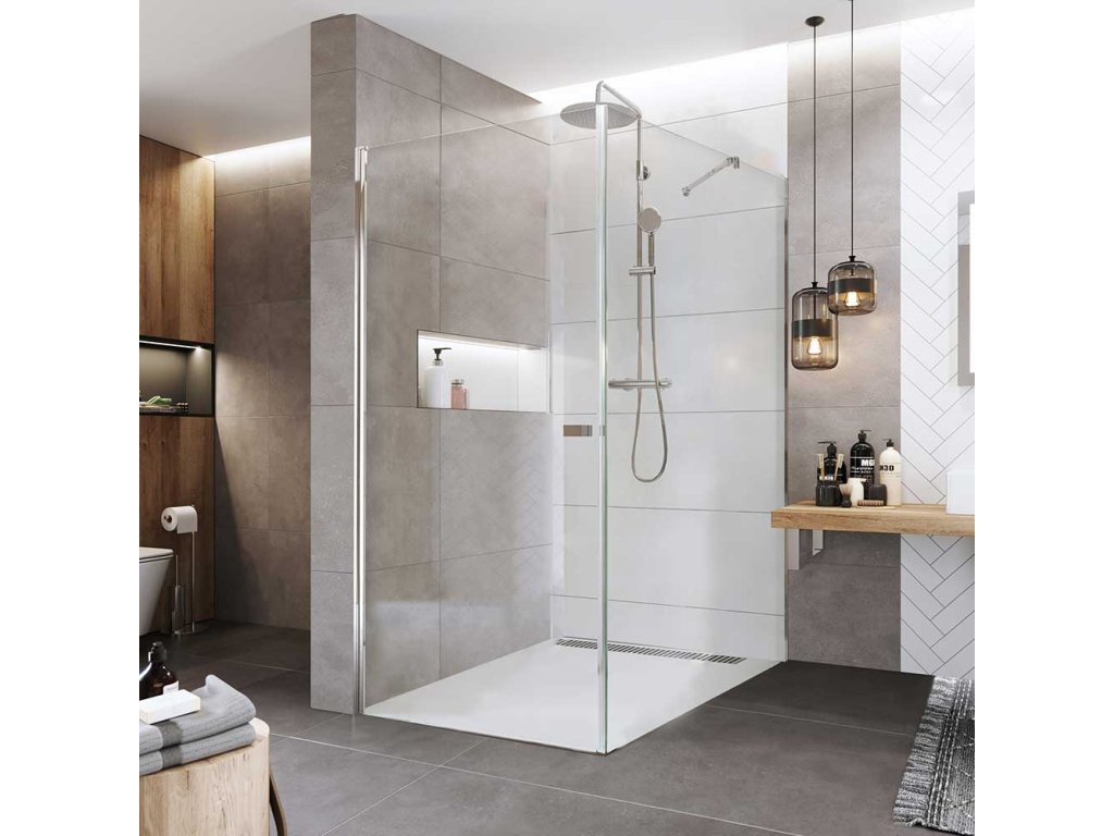 Hliníkové profily v barvě chrom, sklo Čiré, síla skla, obdélník, 700 (dveře) x 1000 (pevný díl), výška 2000 mm.