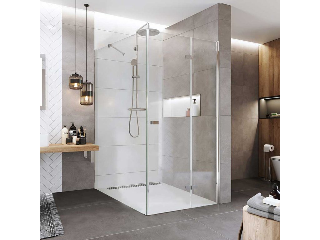 Hliníkové profily v barvě chrom, sklo Čiré, síla skla, obdélník, 1000 (dveře) x 1200 (pevný díl), výška 2000 mm.