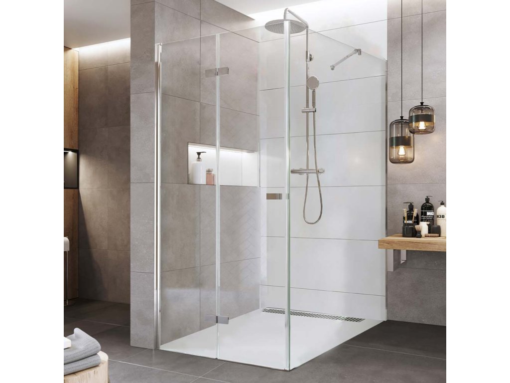 Hliníkové profily v barvě chrom, sklo Čiré, síla skla, obdélník, 1100 (dveře) x 1200 (pevný díl), výška 2000 mm.