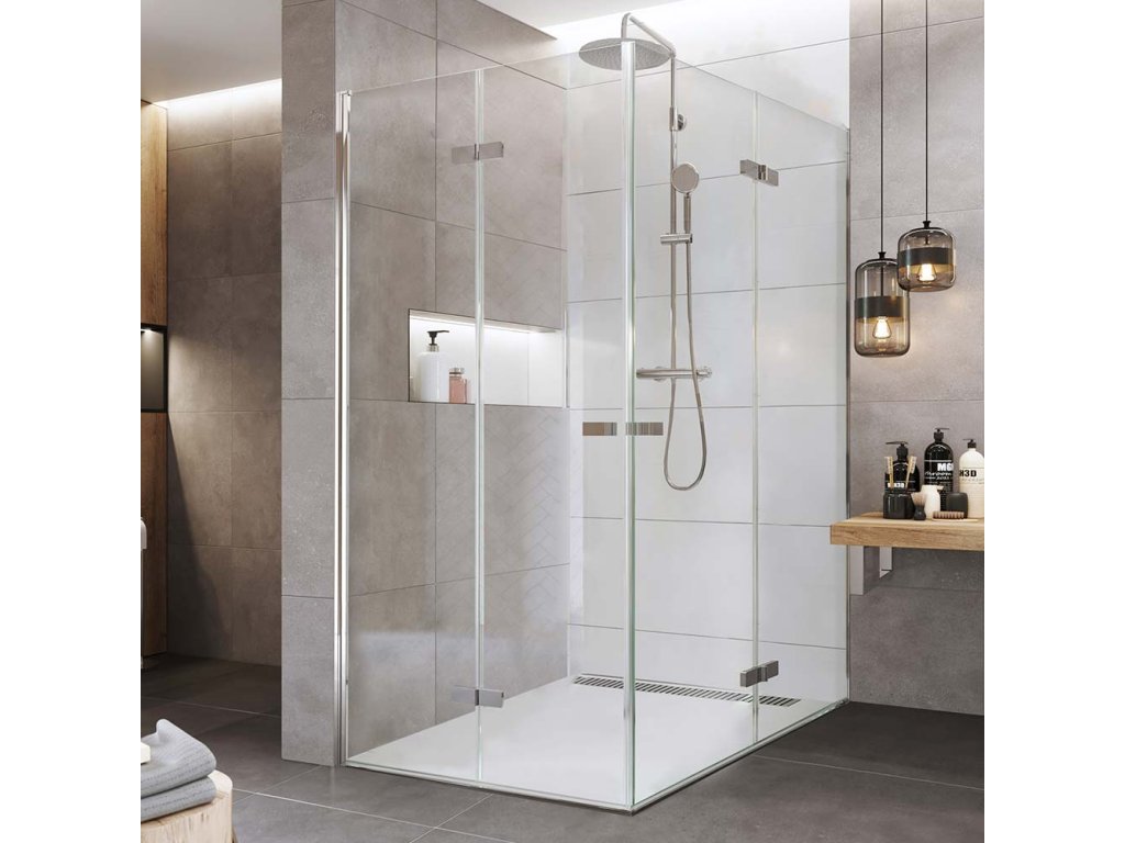 Hliníkové profily v barvě chrom, sklo Čiré, síla skla 6/6 mm, obdélník, rozměr 1100x1200 mm, výška 2000 mm, vstup rohem.