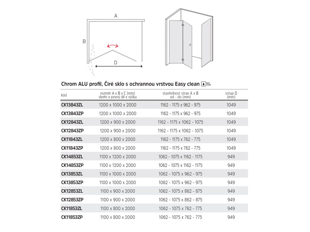 Hliníkové profily v barvě chrom, sklo Čiré, síla skla, obdélník, 1100 (dveře) x 800 (pevný díl), výška 2000 mm.